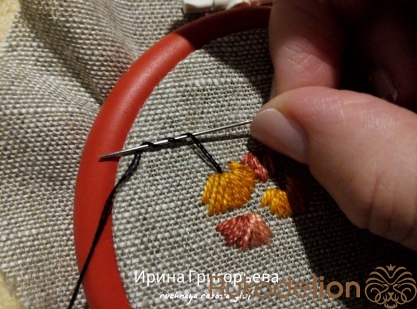 Вышейте стебли коричневой и зелёной нитями в одно сложение швом "шнурок". Сначала сделайте прямые стежки швом " вперёд иголку, далее, не прокалывая ткань, объвейте каждый стежок 2-3 раза.