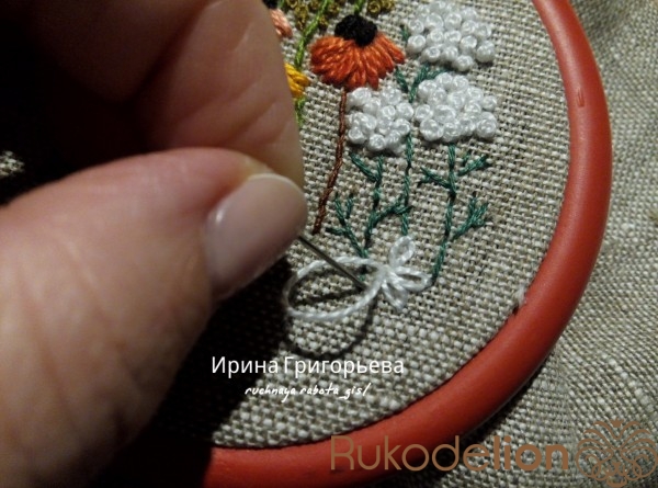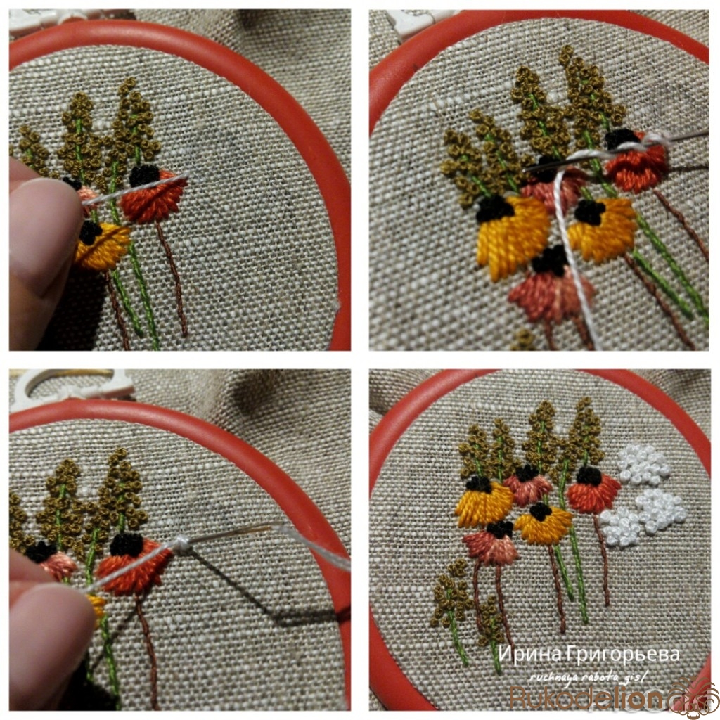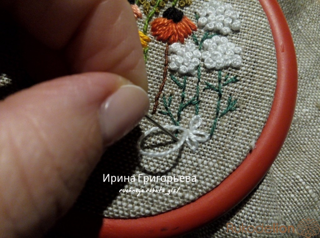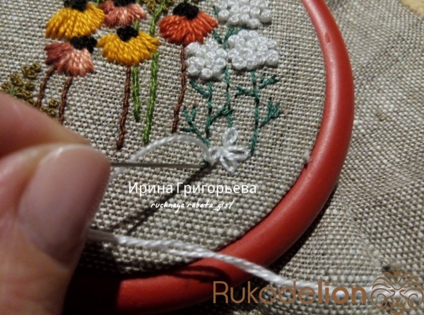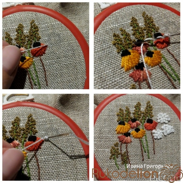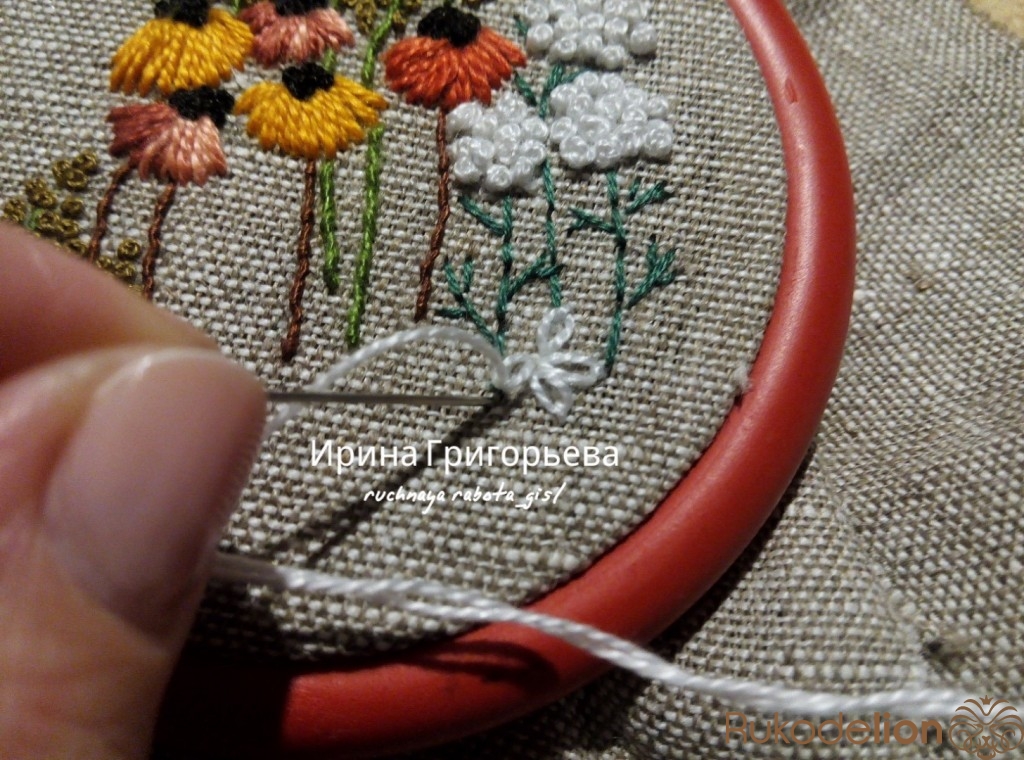 Вышейте французскими узелками нитью белого цвета травку справа от цветов.