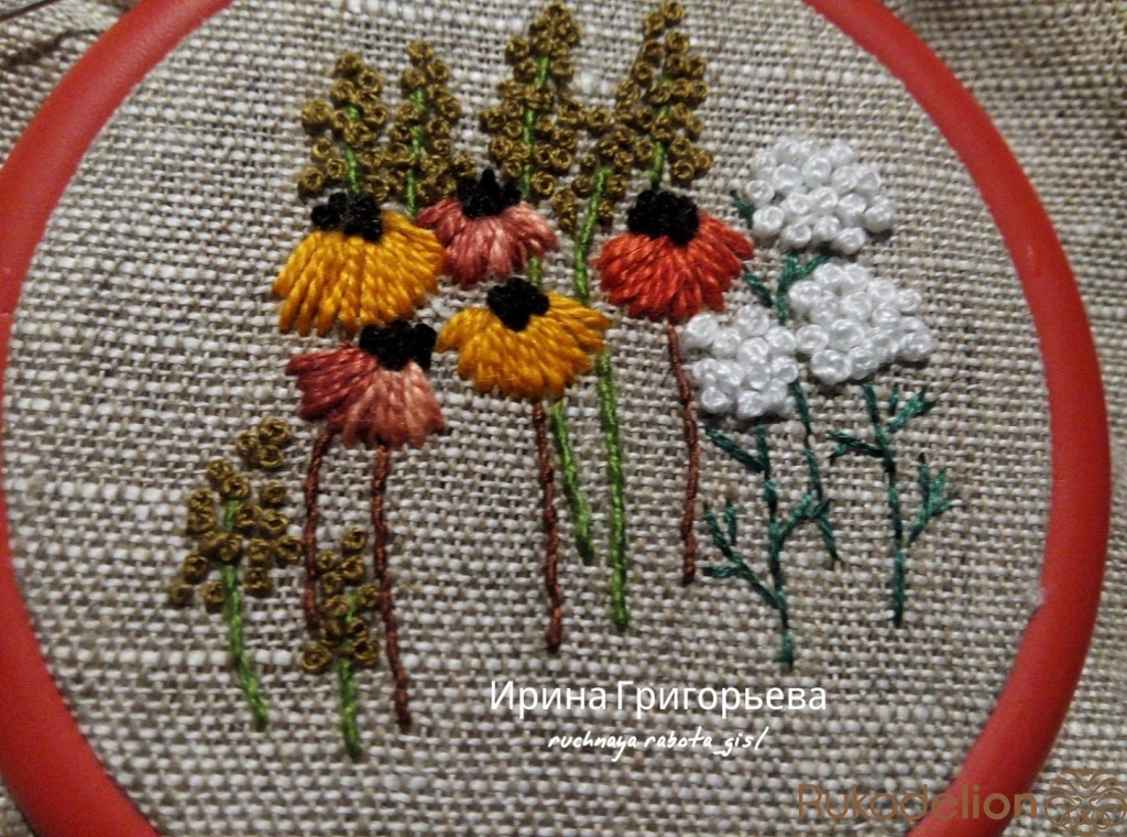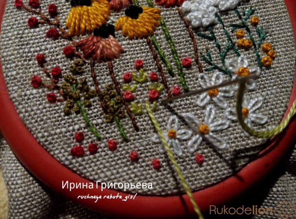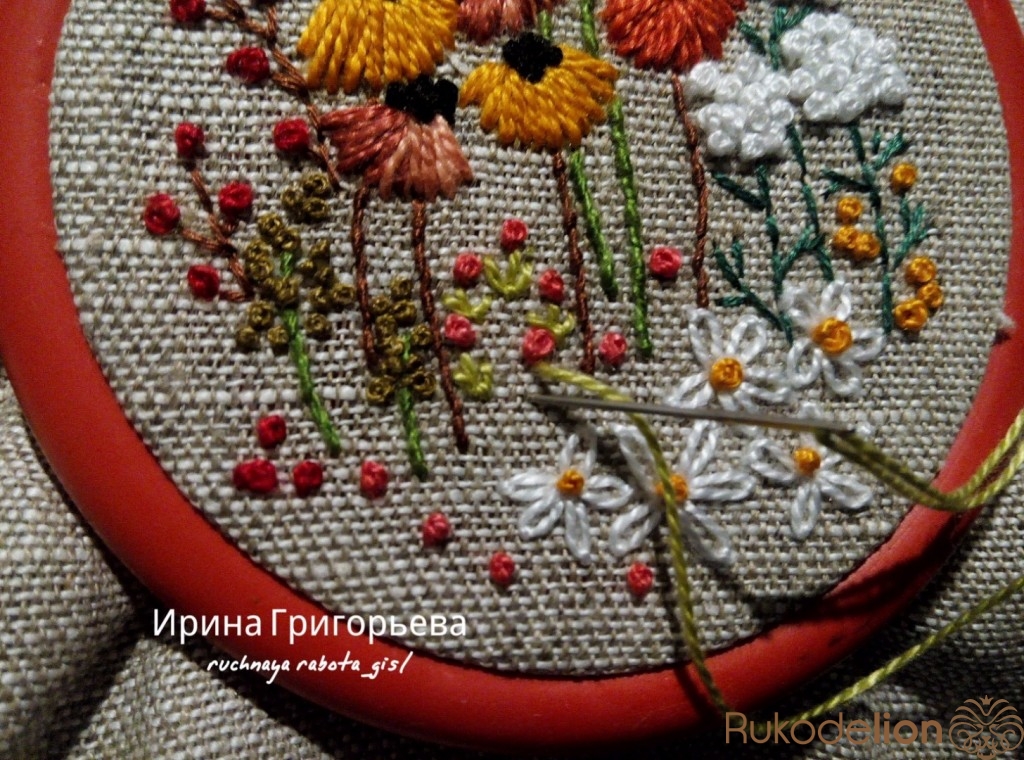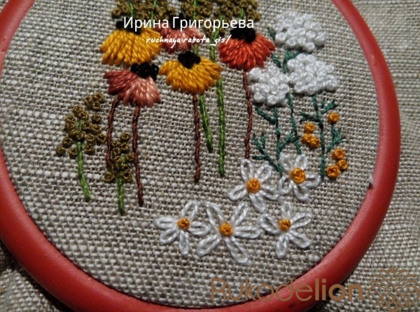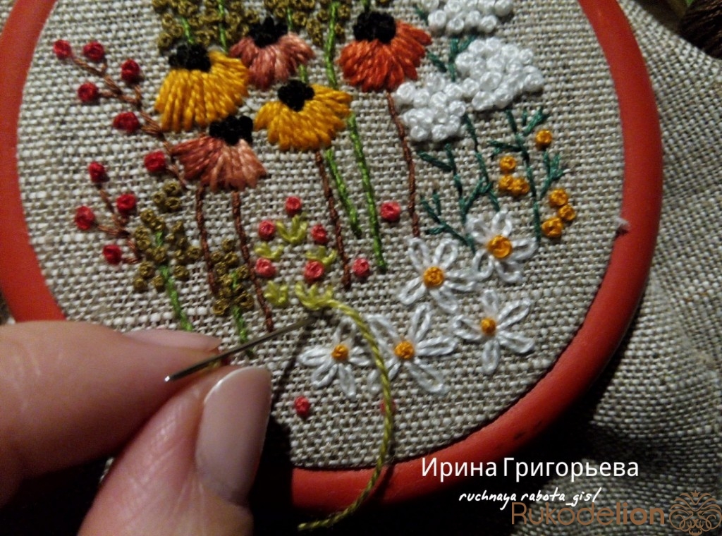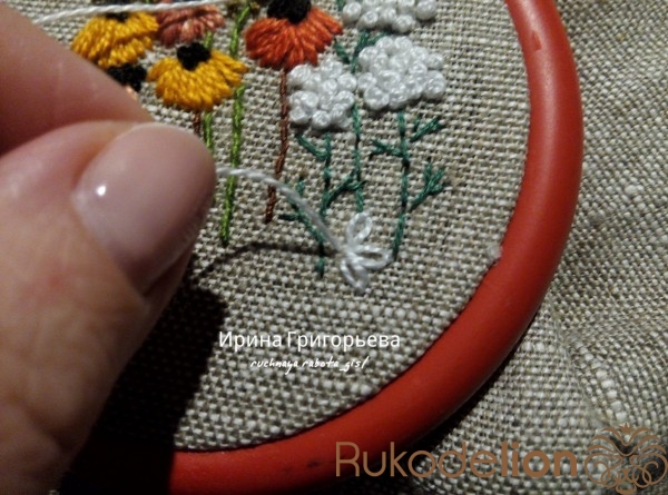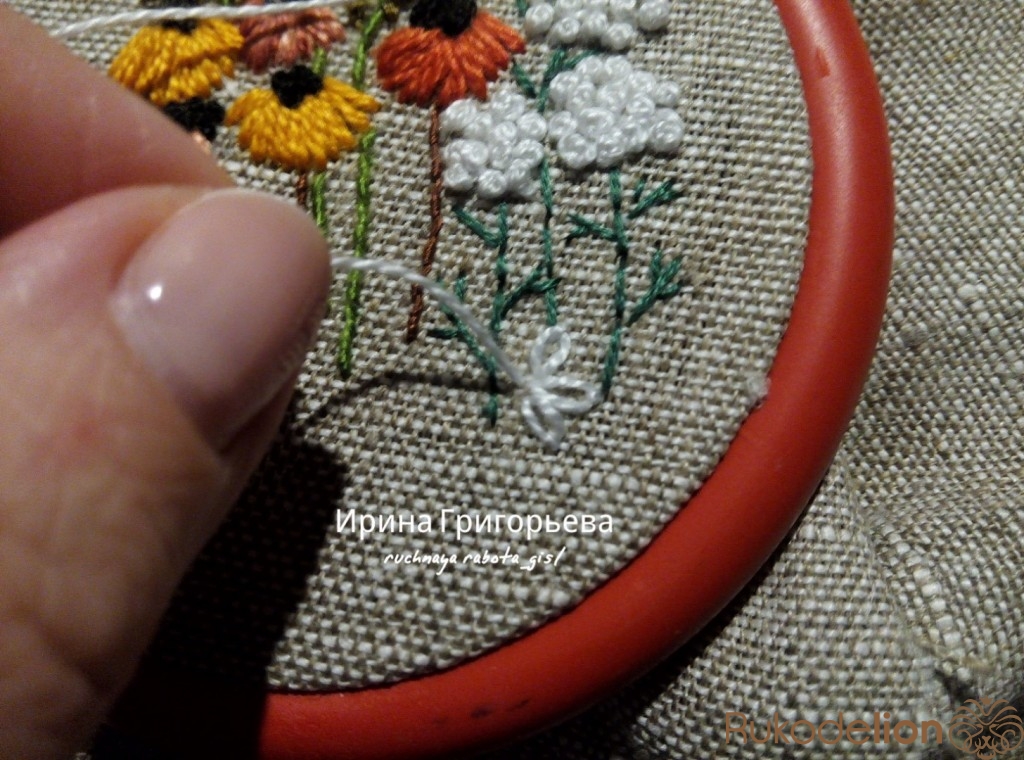 Сердцевины ромашек вышейте французскими узелками нитью жёлтого цвета. Также вышейте несколько жёлтых фрузелков между стеблями травы.