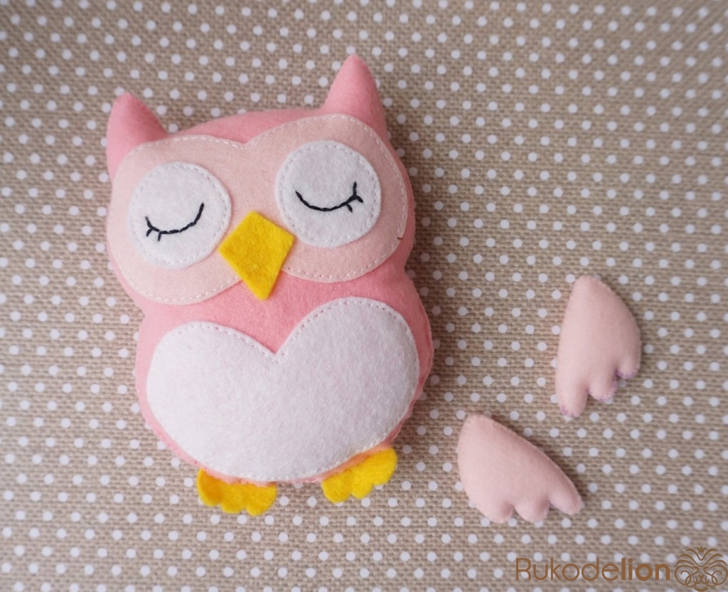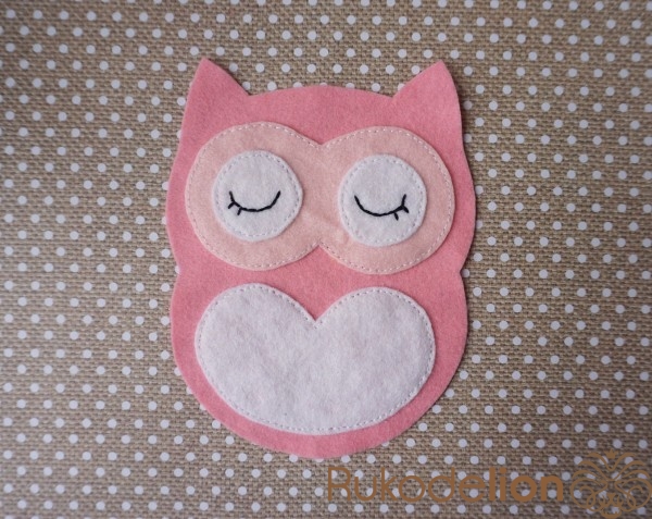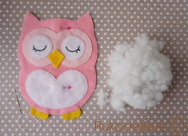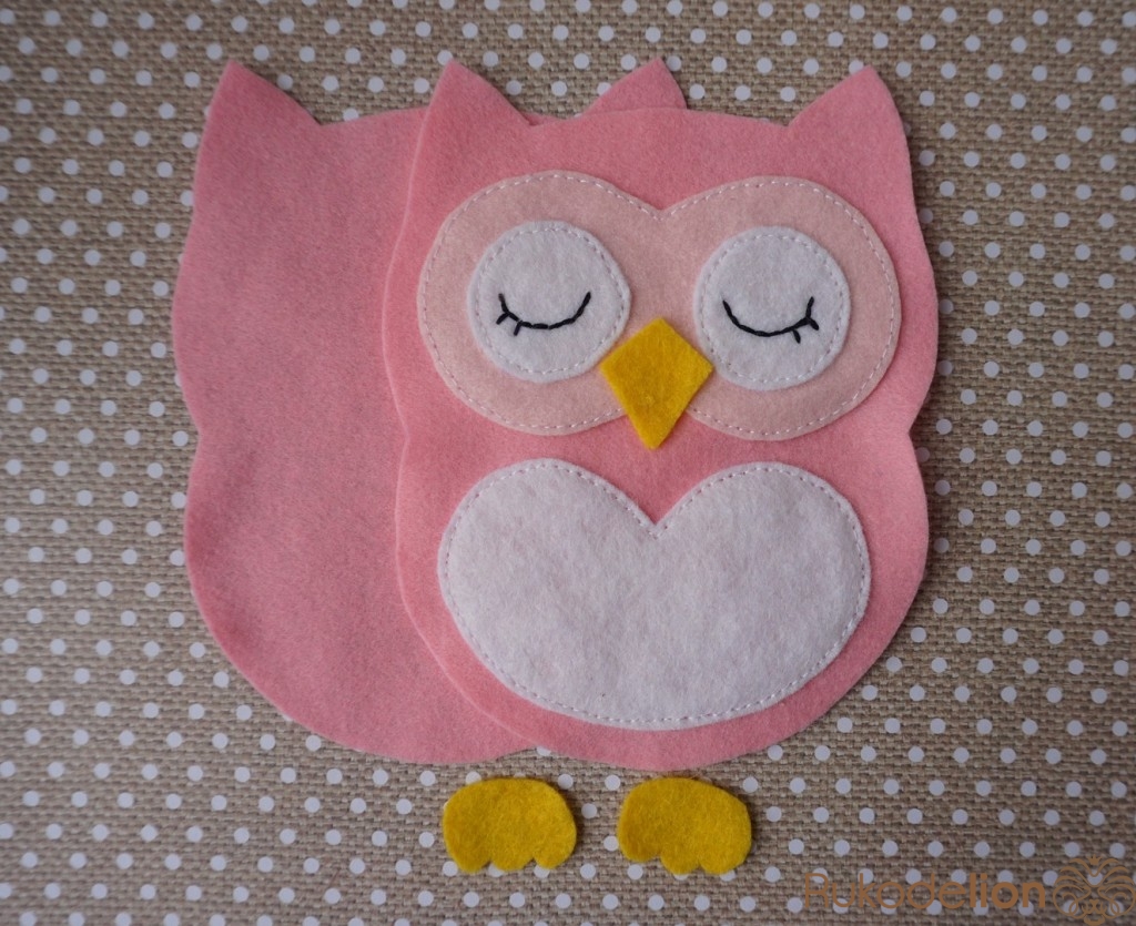 Сшиваем две детали для тела нашей совушки. Лапки для удобства вшивания немного прихватываем на клей или подкалываем булавками.