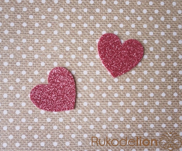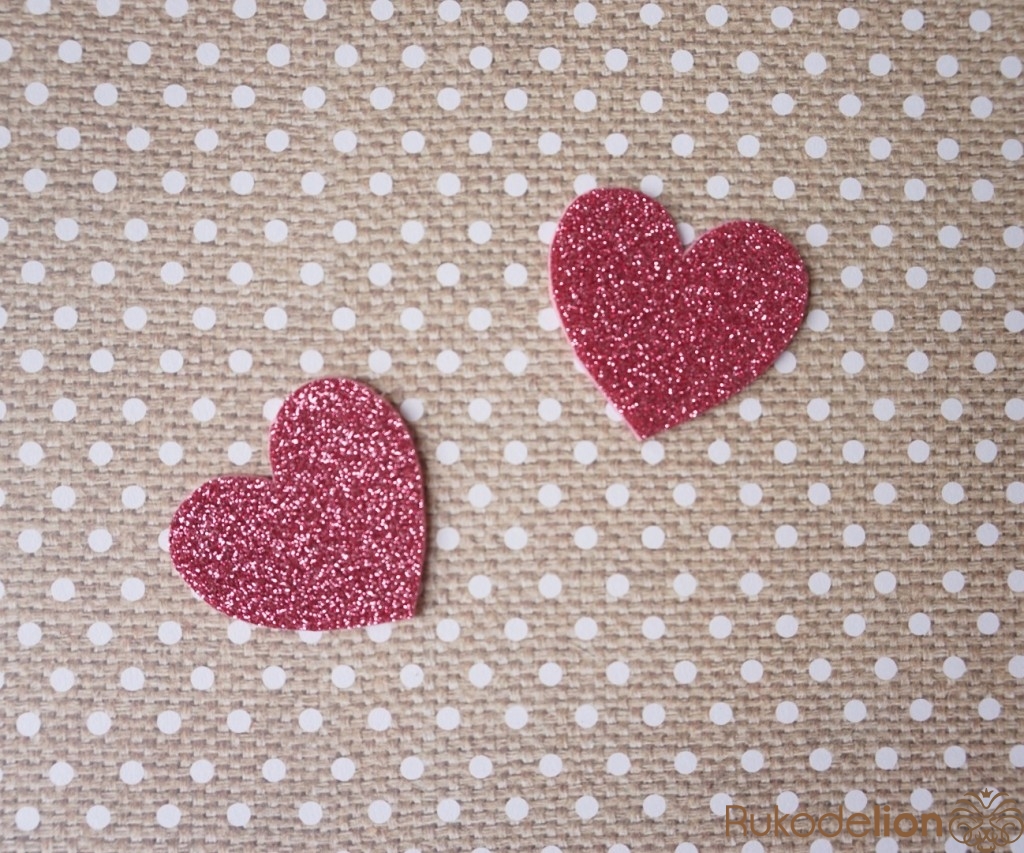 Из жесткого фетра с блестками вырезаем сердечки, он очень плотный и хорошо держит форму. Приклеиваем сердечки к крылышкам при помощи клеевого пистолета.