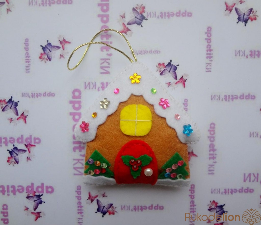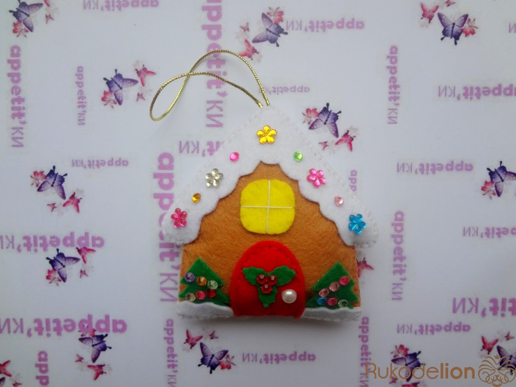 Пряничный домик сшит полностью вручную из фетра. Украшен стразами. Размер - 9 см