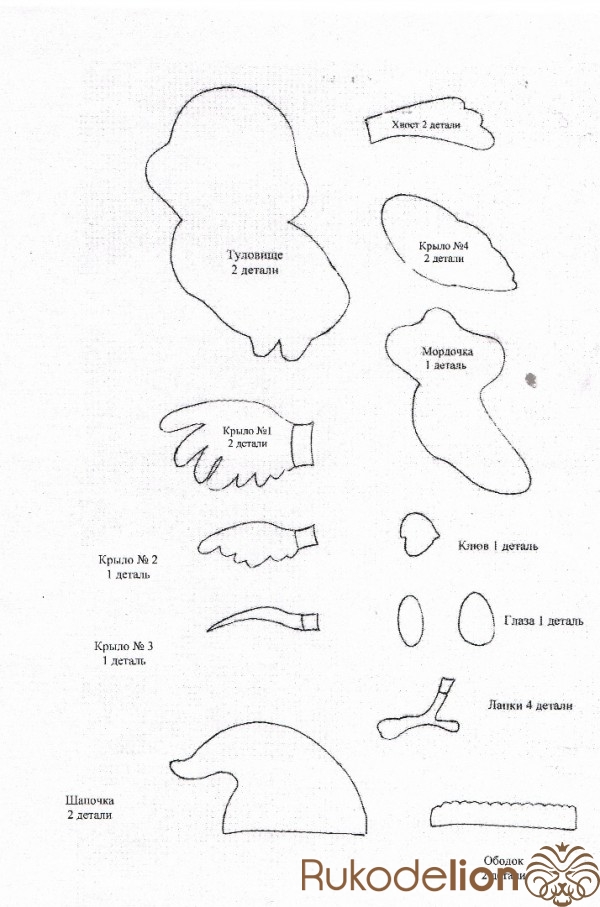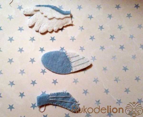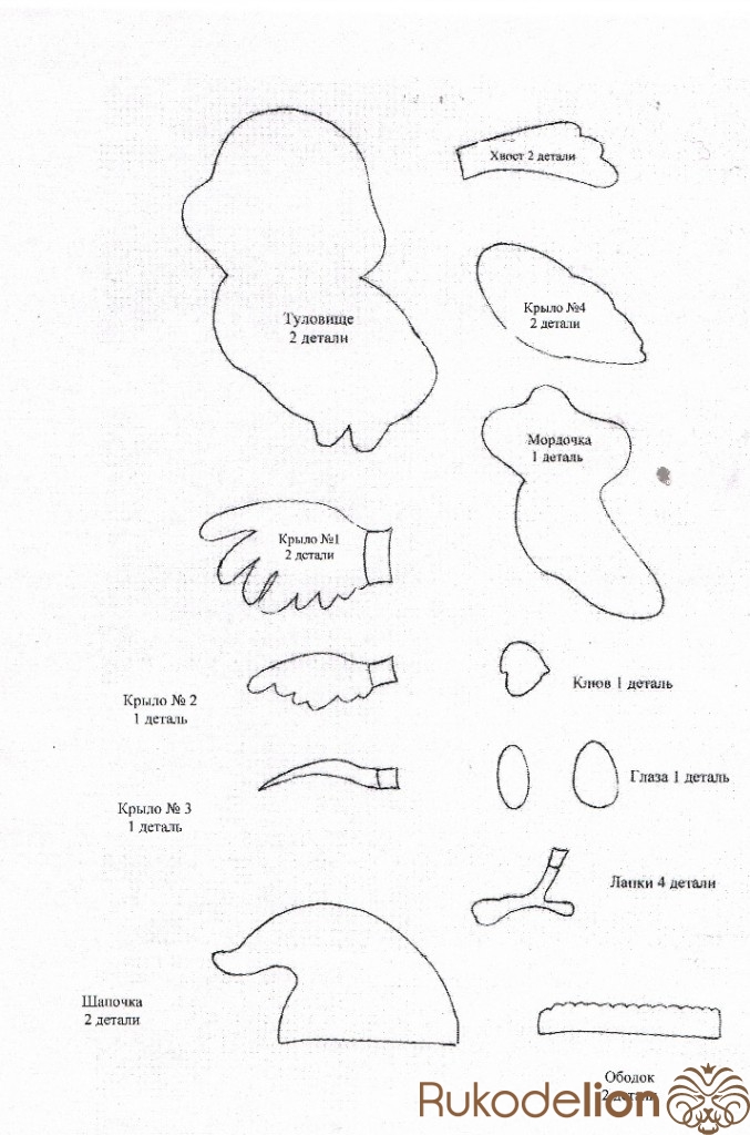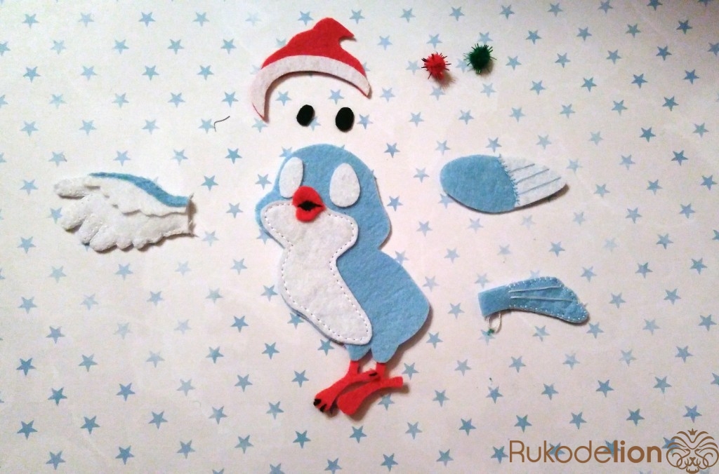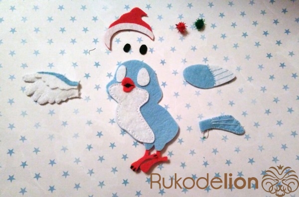 Обводим самоизчезающим маркером выкройки на фетре (на голубом и вырезаем 2 детали туловища, крыло №3 1 деталь, хвост 2 детали, крыло №4 2 детали; на белом фетре - крыло №1 2 детали, крыло № 2 1 деталь, мордочка-грудка 1 деталь, глаза по 1 детали, ободок шапки 1 деталь; на красном фетре - клюв 1 деталь, лапки 4 детали, шапочка 1 деталь )