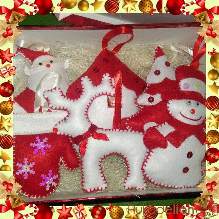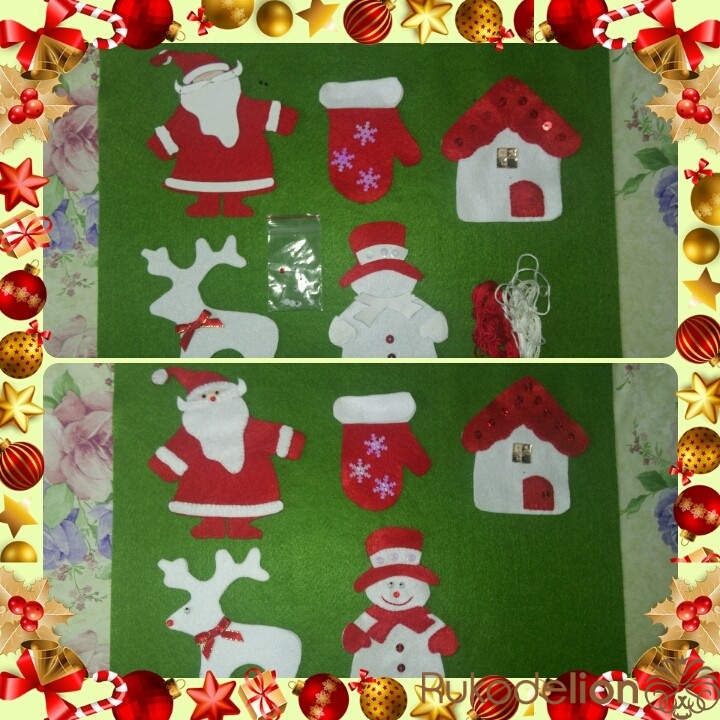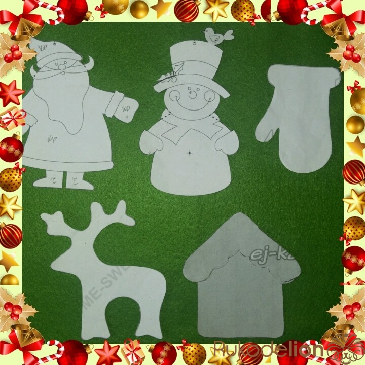 Дед Мороз, Снеговик, Олень, Варежка, Дом ( их основа) 2 части. А украшения ( крыша, шарф, варежки Снеговика, детали Деда Мороза из белого фетра, крыша, дверь, одинарные)