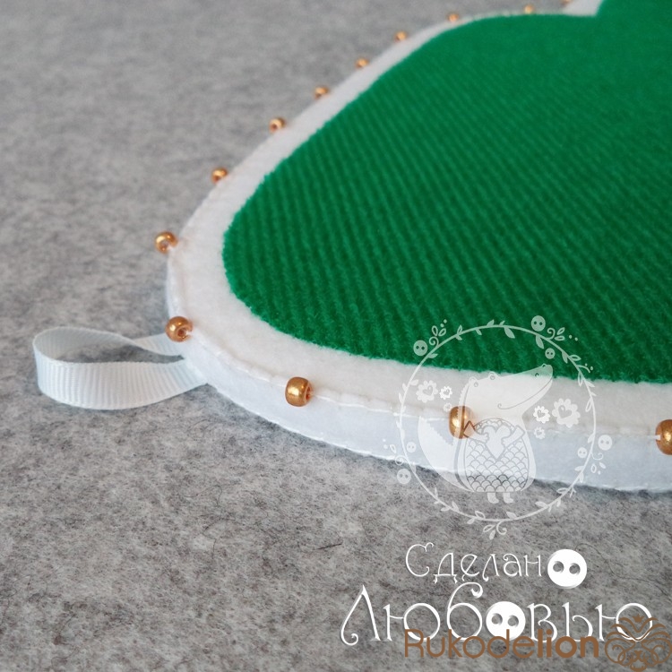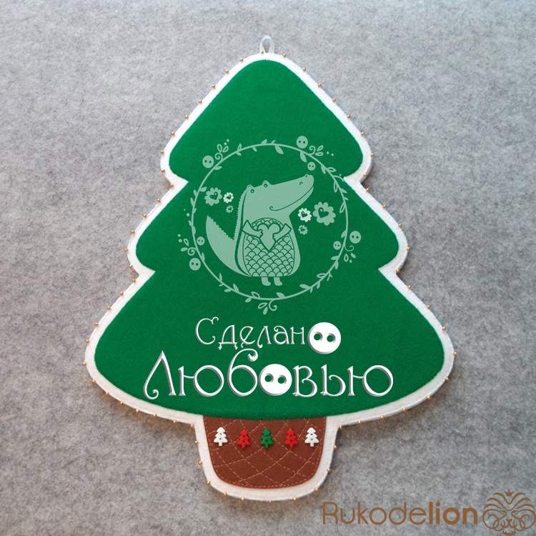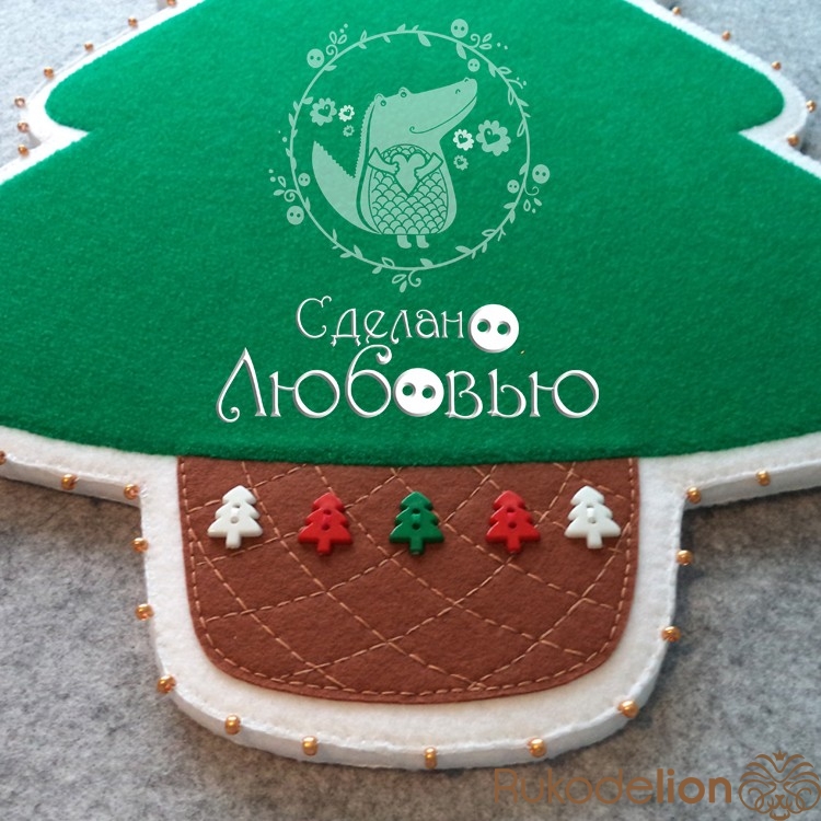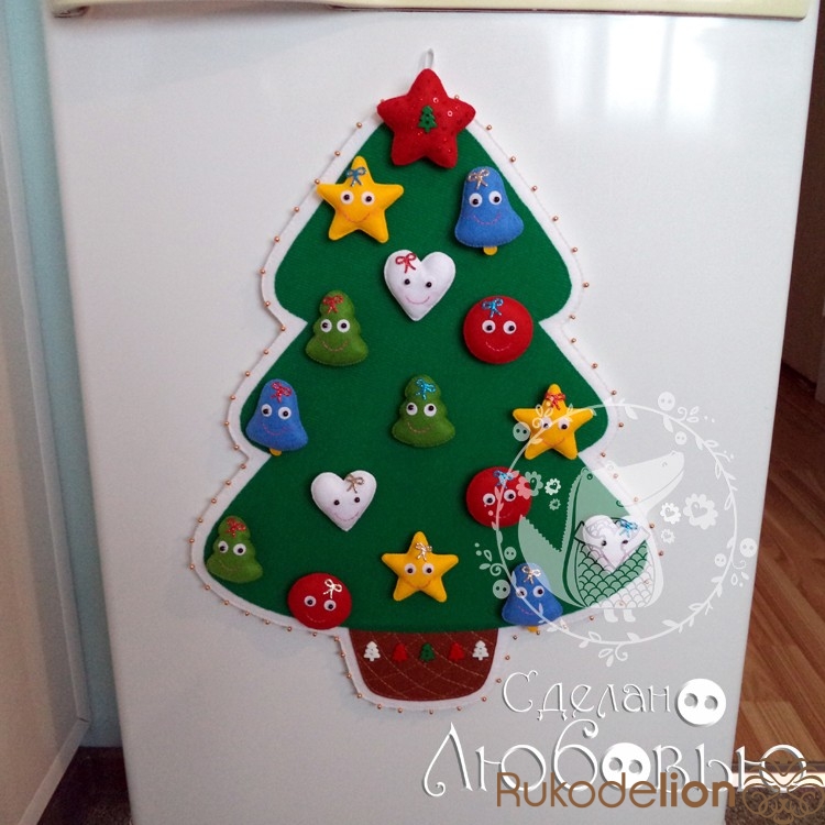 Ёлочка из фетра и велкро ткани, высота - 48 см, ширина - 37 см, толщина -12 мм. В ёлочку надежно вшиты 7 магнитов, по этому она прекрасно держится на ровной металлической поверхности, например на холодильнике. Так же на макушке есть петелька, за которую ёлочку можно повесить на стену.