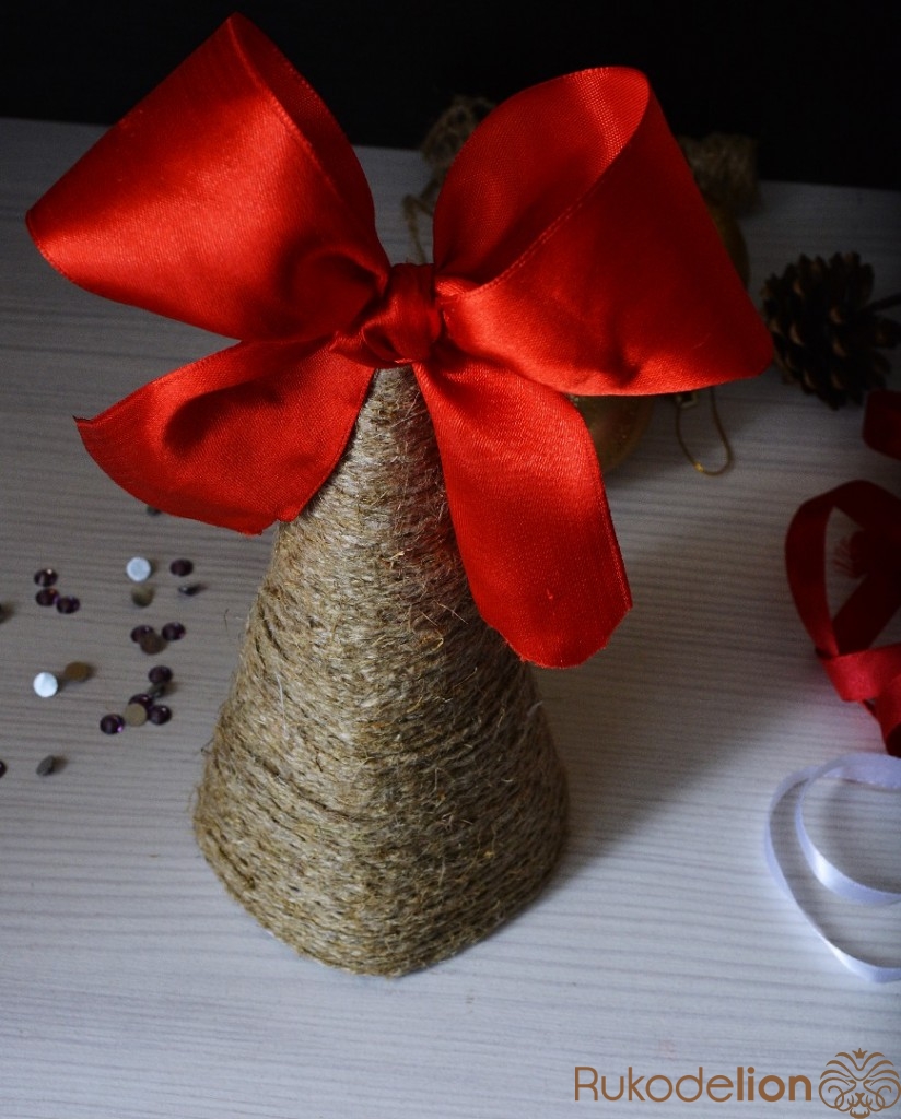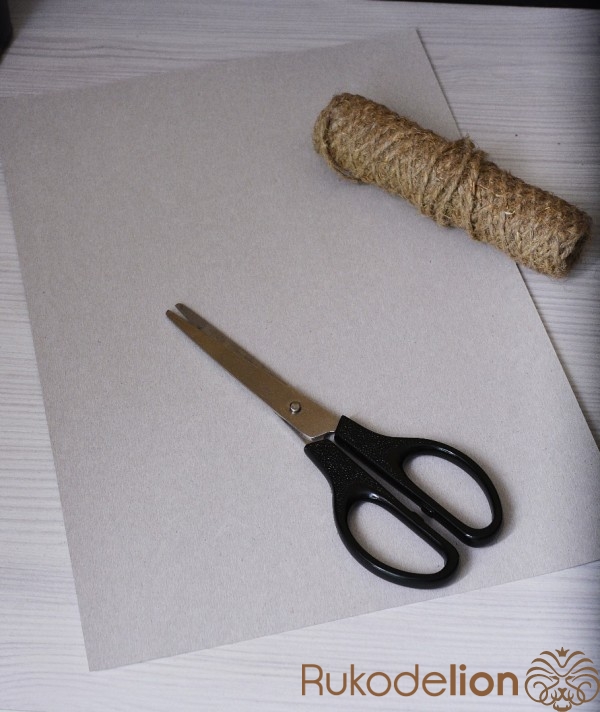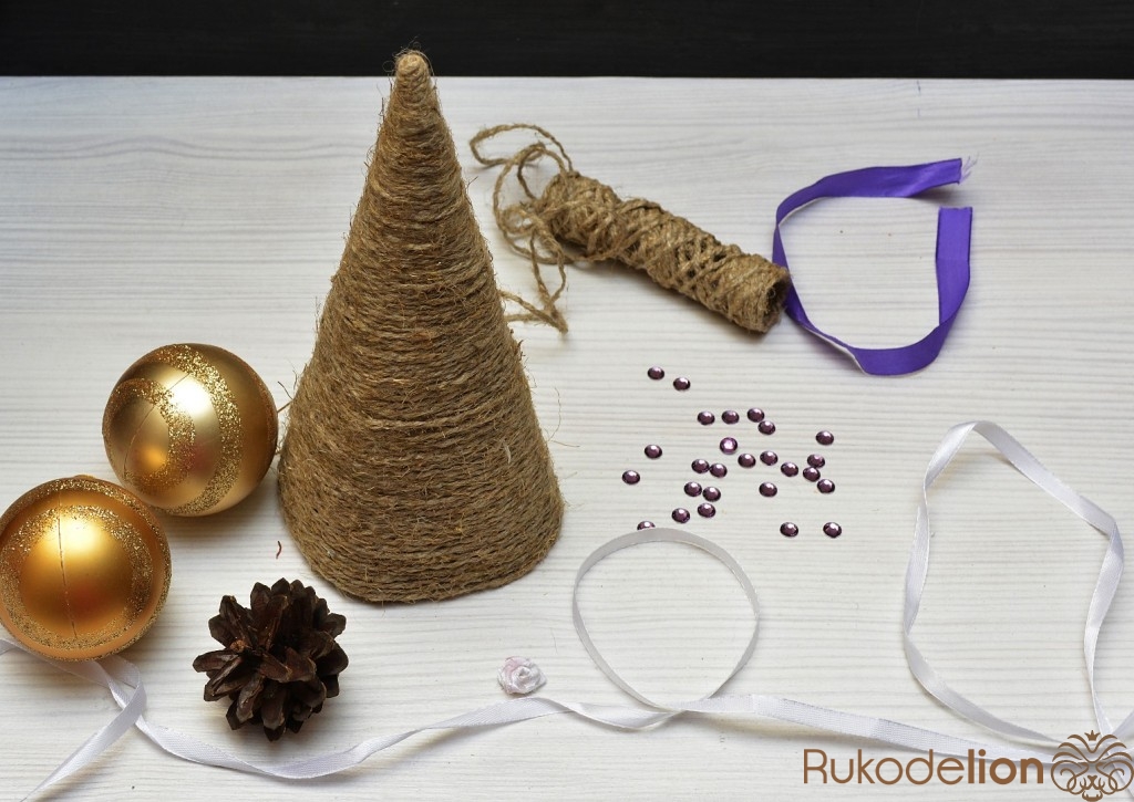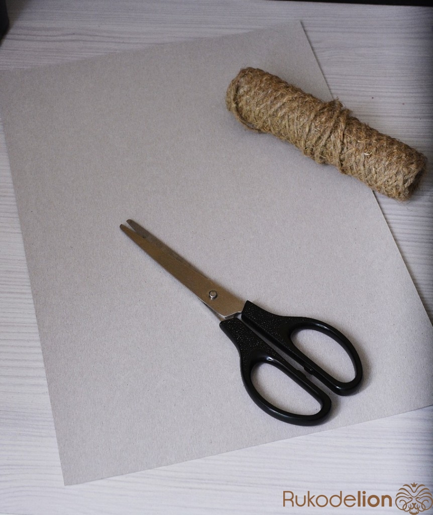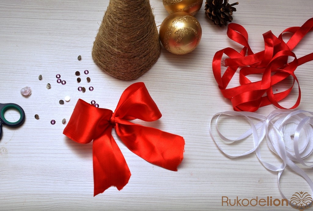 картон, ножницы, клеевой пистолет, шпагат, атласные ленты разной ширины и цвета, клеевые стразы, сосновая шишка.