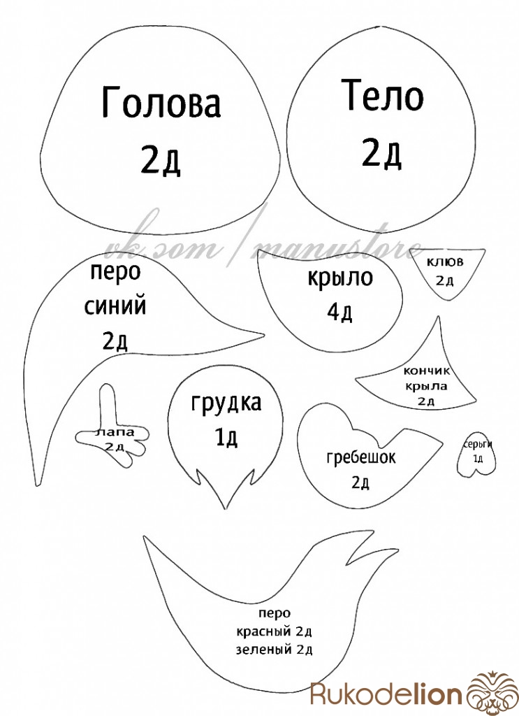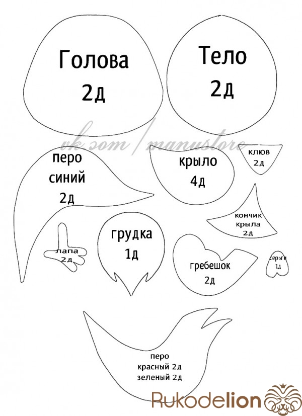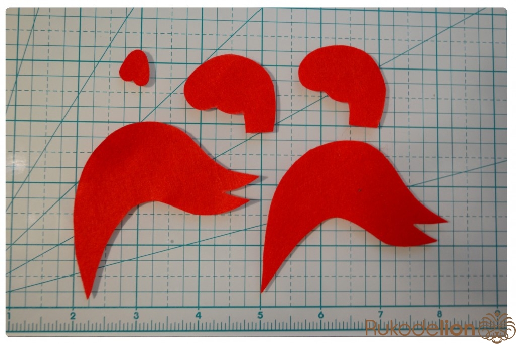 Из красного фетра мы вырезаем два красных пера, две детали гребешка и одну деталь сережек