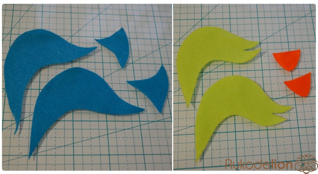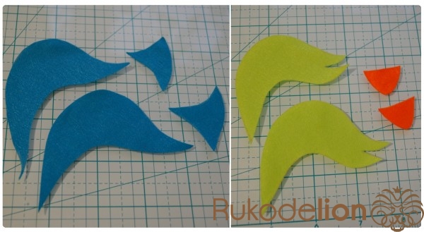 Из синего фетра вырезаем два пера и два кончика крыла. Из салатового - два пера, а из рыжего - две детали клюва