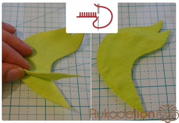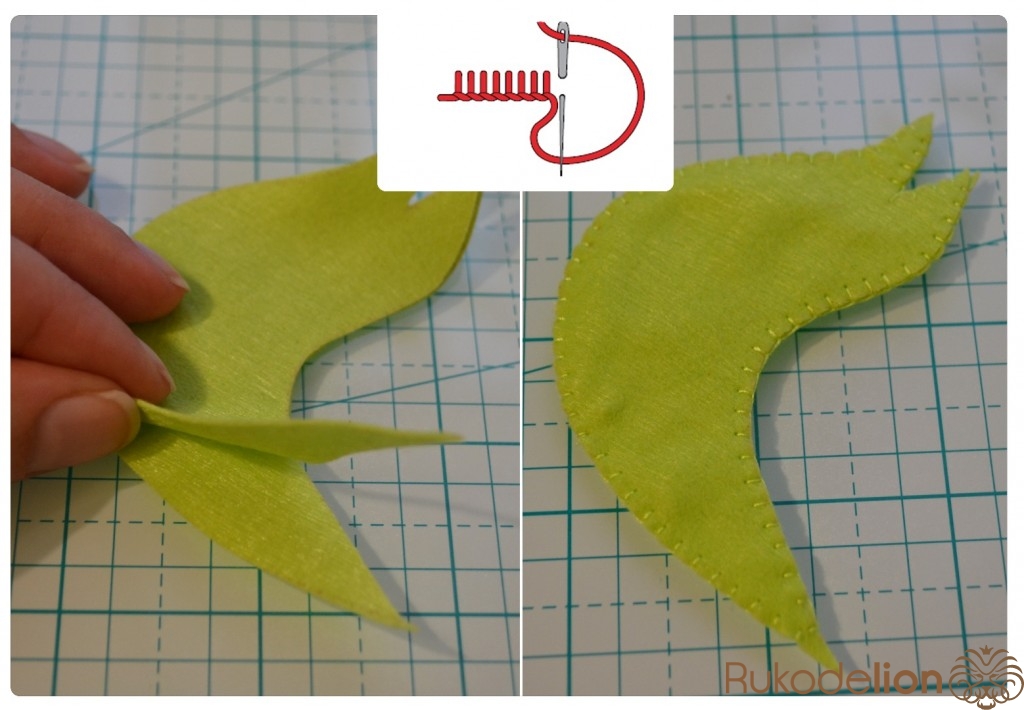 Складываем парой две детали салатового пера и сшиваем их салатовыми нитками обметочным швом, как это показано на схеме. Перышки мы не набиваем синтепоном
