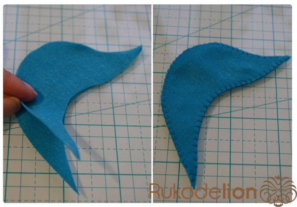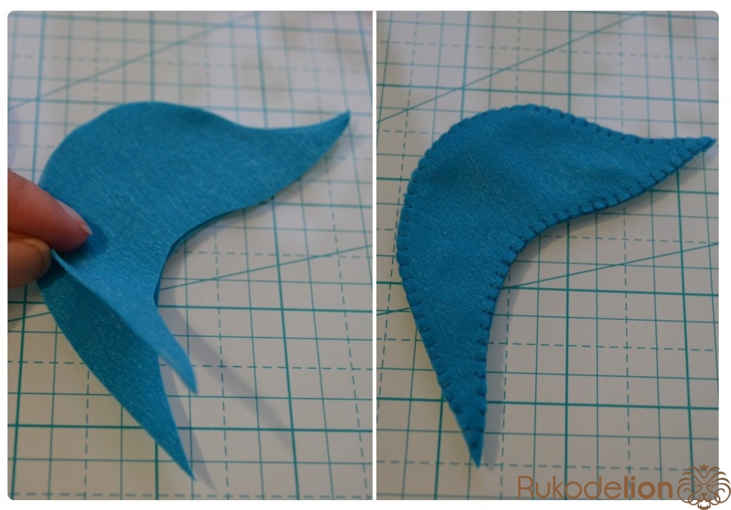 Набиваем гребешок синтепоном и заканчиваем обметочный шов. Не нужно сильно набивать синтепоном нижнюю часть гребешка, которая будет вшиваться в голову