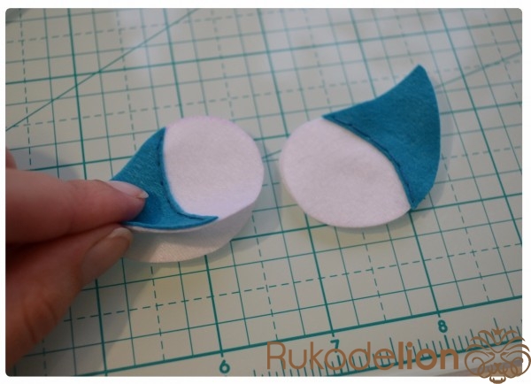 Приклеиваем черные круги по центру нарисованных синих. Вырезаем глазки по линиям и приклеиваем их на мордочку клеем Момент Кристалл
