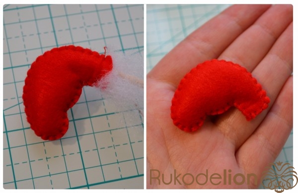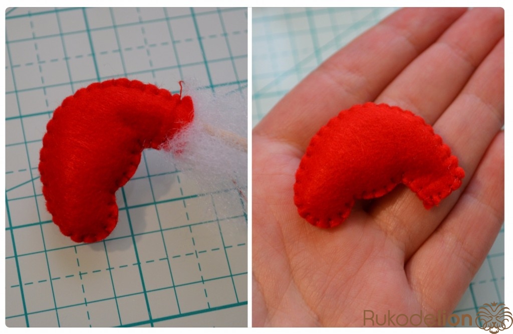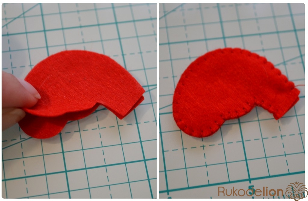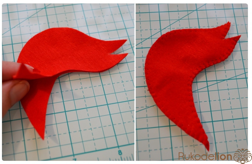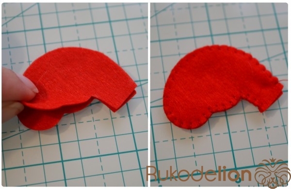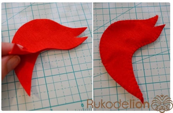 Складываем две детали гребешка. Сшиваем их обметочным швом красными нитками, но не до конца - оставляем отверстие для набивки синтепоном