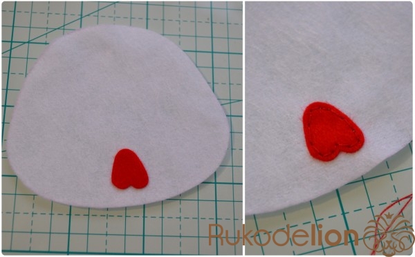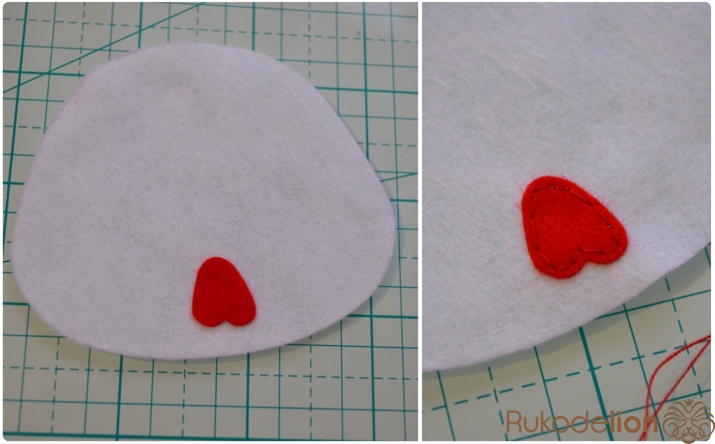 Складываем две детали головы и начинаем сшивать их белыми нитками обметочным швом. Для удобства можете пометить себе, где нам нужно будет вложить петельку, чтобы не забыть про нее