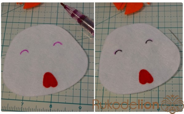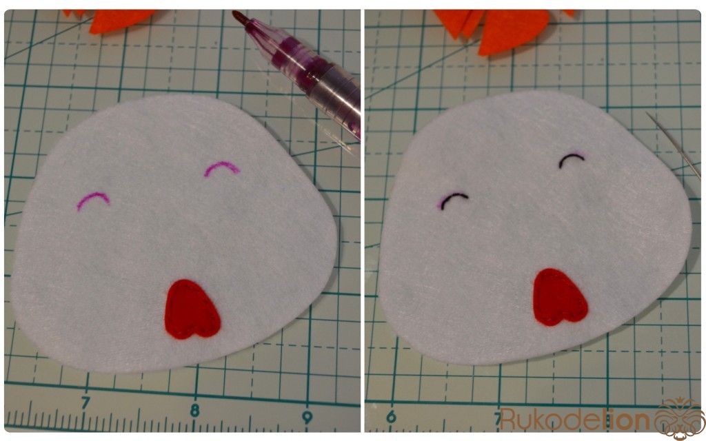 Самоисчезающим маркером нарисуем на детали головы с пришитыми серьгами будущие бровки петуха. Вышиваем бровки двойной черной ниткой швом "назад иголка"