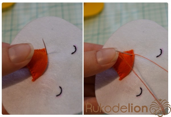 На уголке клюва у нас осталась нитка с иголкой. Вдеваем иголку в белую мордочку, в том месте, где у нас оказался левый край клюва, и пропускаем нить насквозь белой детали Затем возвращаем нить  чуть выше клюва. Теперь вдеваем ее в край клюва и проводим через клюв и белую деталь вниз и так по спирали по часовой стрелке мелким стежками  мы пришиваем клюв, сначала сверху, затем снизу, но не до конца...