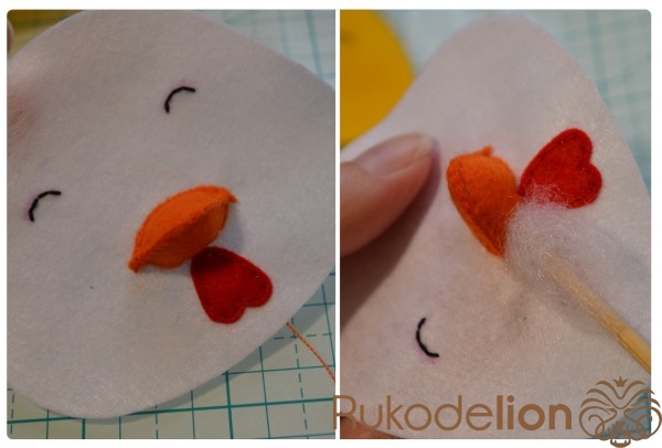 Кладем в клюв небольшой шарик синтепона и прикладываем клюв к мордочке, на то место, куда мы будем его пришивать