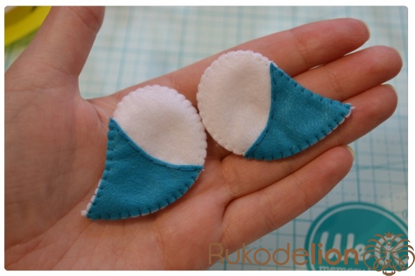 Ну и раз мы начали шить синими нитками, давайте сделаем и другие синие детали нашего петушка. На две детали крылышек прикладываем их синие кончики. Пришиваем внутренний край синими нитками швом "назад иголка"