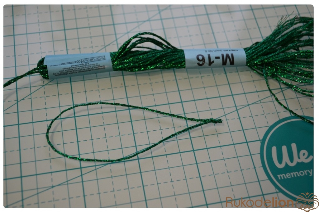 Перед тем как сшивать детали головы, нам нужно приготовить петельку для подвешивания. Обычно я использую мулине с блестками. Отрезаем небольшой отрезок нити, складываем пополам и завязываем на конце узелок