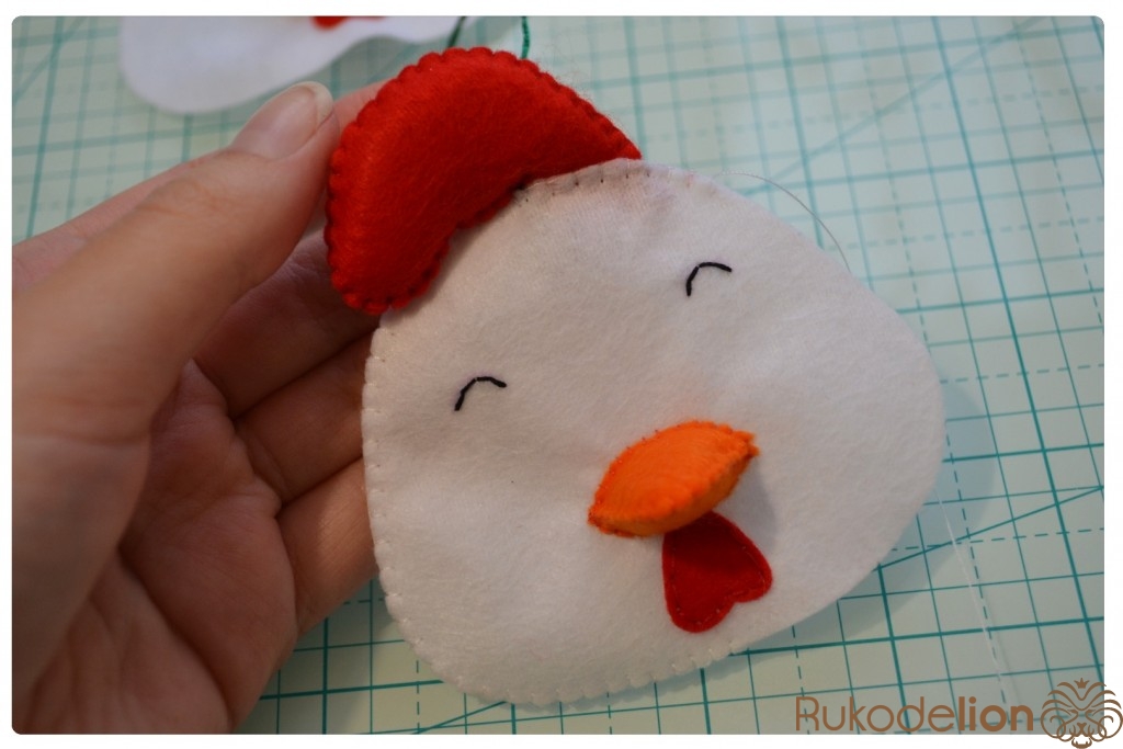 Тут же мы вкладываем гребешок. Его нужно вложить так, чтобы он закрыл петельку, а также как бы нависал на лоб петуха. Продолжаем вести обметочный шов через гребешок и далее по кругу