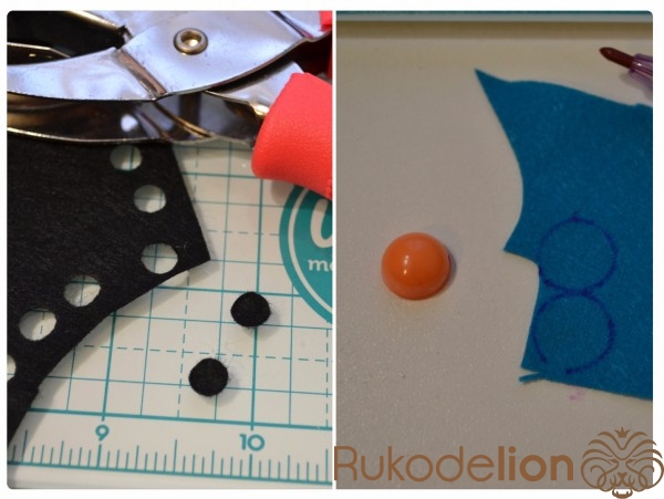 Теперь нам нужно сделать глазки для нашего петушка. Дыроколом по фетру из черного фетра вырубаем два круга. У нас должны получиться круги диаметром 5 мм. На синем фетре рисуем круги где-то 1 см шириной. Обычно для этого я обвожу какую-нибудь полубусину