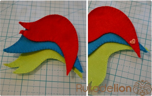 Складываем перышки хвоста. Чтобы их соединить я сшиваю их внизу пуговкой
