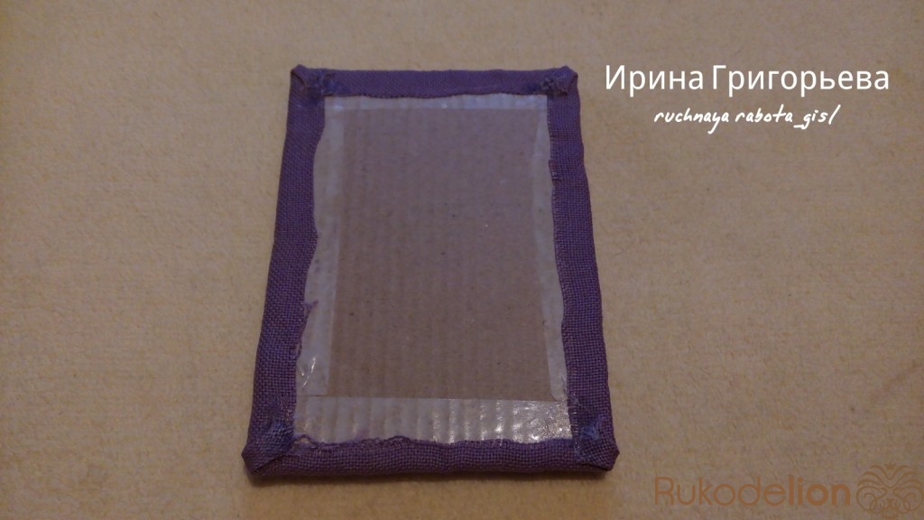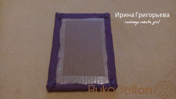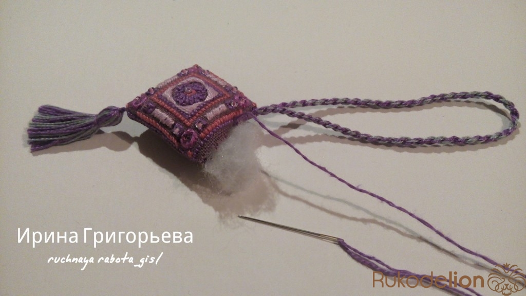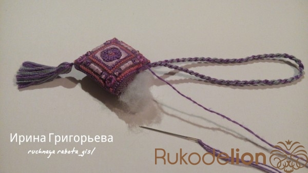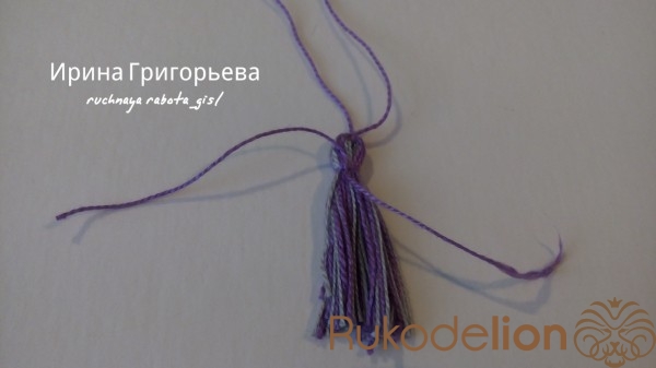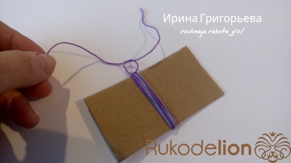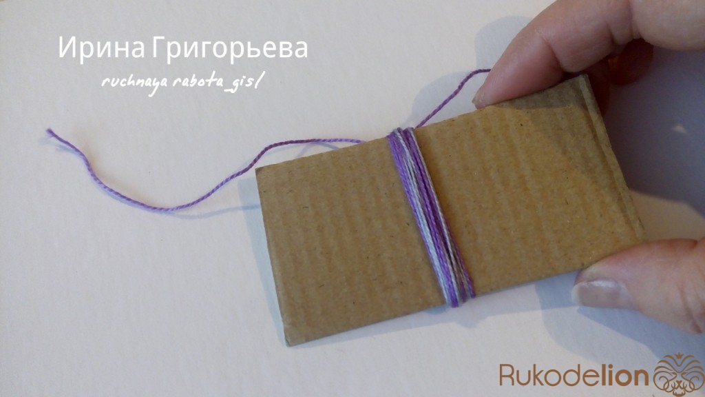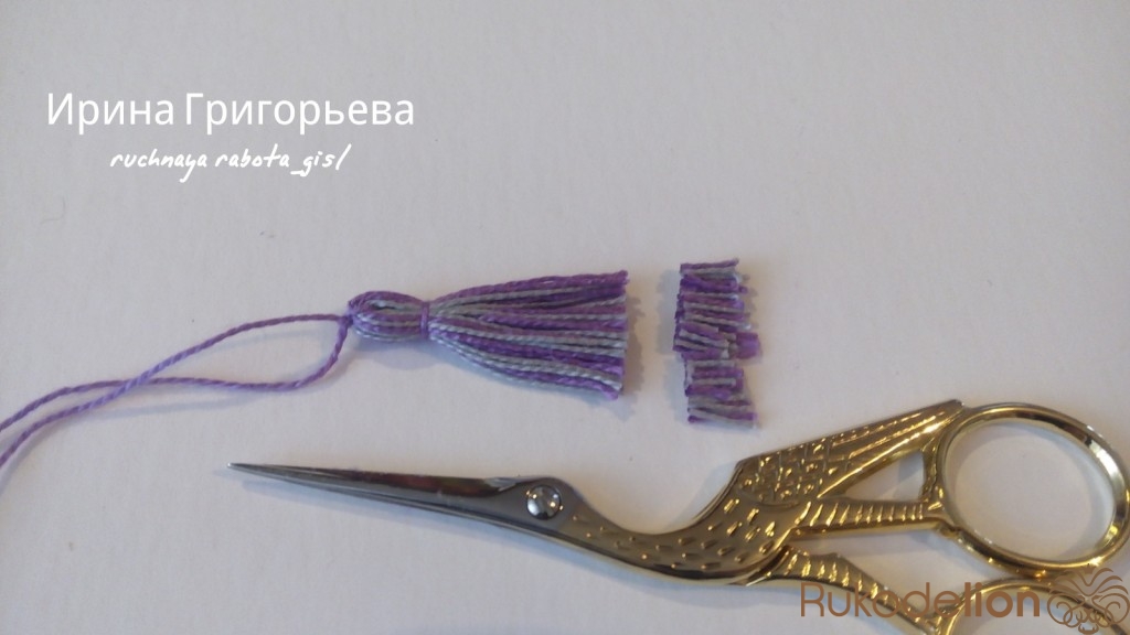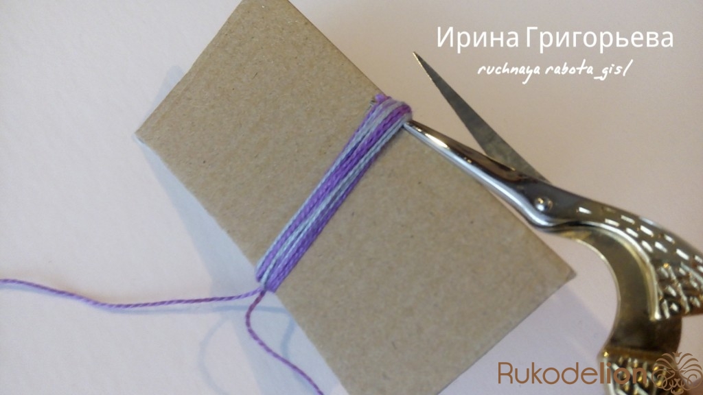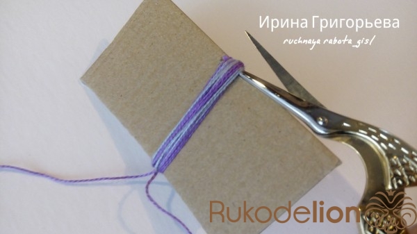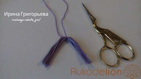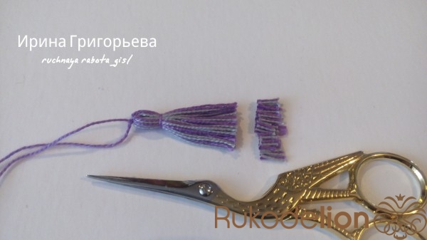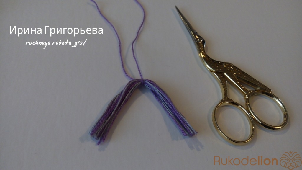Для пошива маячка для ножниц нам понадобятся две детали с контурным швом "назад иголку". Для начала изготовим украшение для маячка - кисточку. Для этого возьмите кусочек картона, сверху положите нить (для закрепления кисти), намотайте на картон необходимое количество нитей ( я сделала около 10 оборотов). Разрежьте нити снизу. Отступив от верхнего края около сантиметра, перевяжите кисть нитью, заправьте концы нить в середину кисти. Обрежьте кончики кисти.