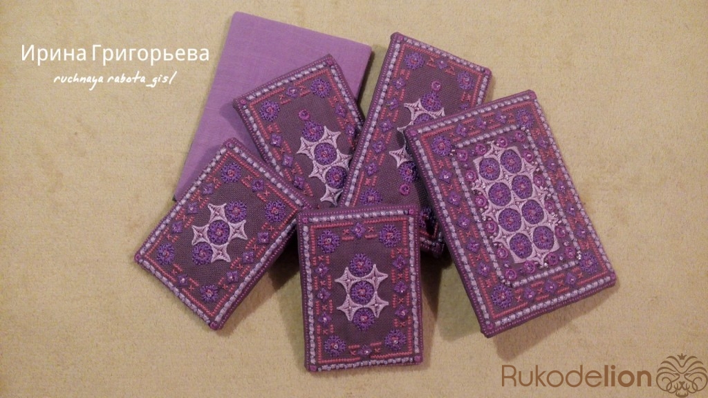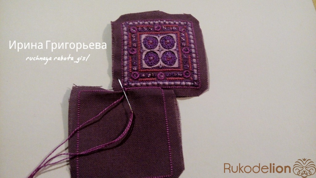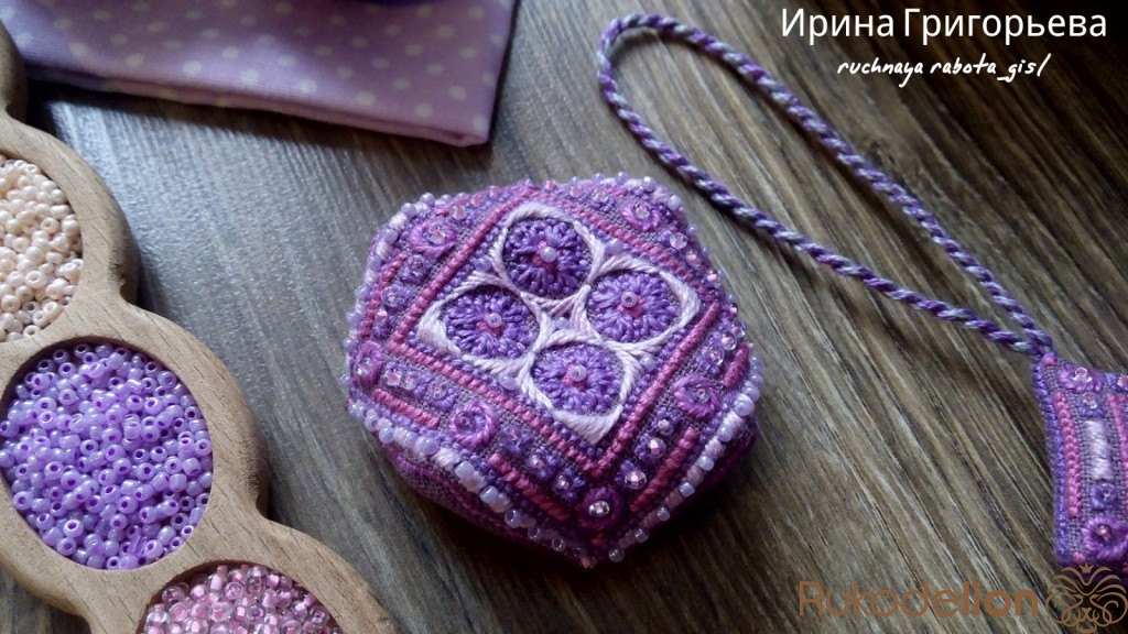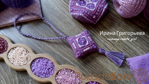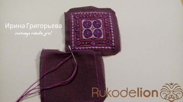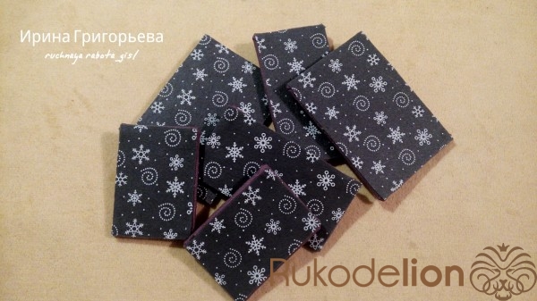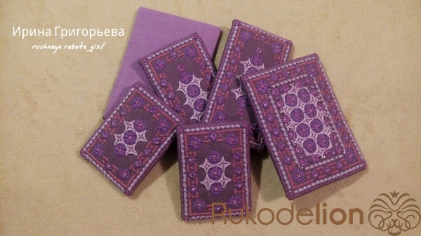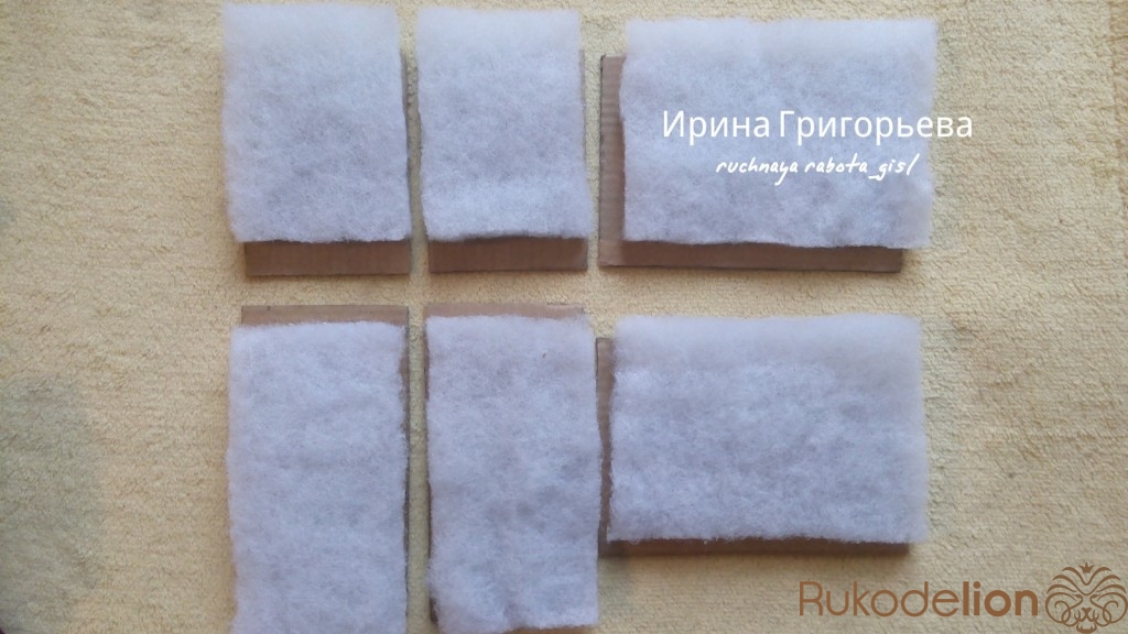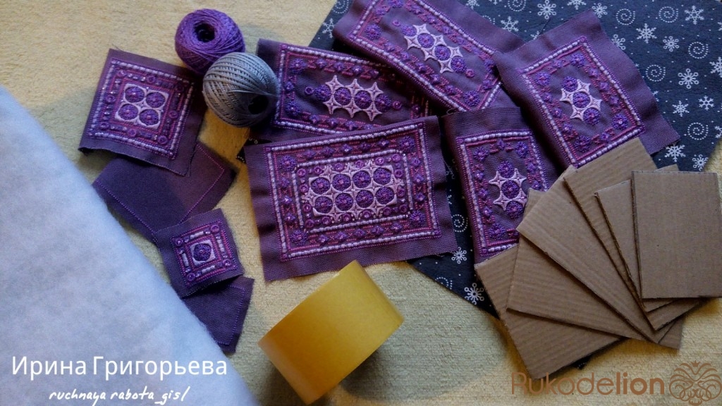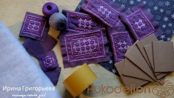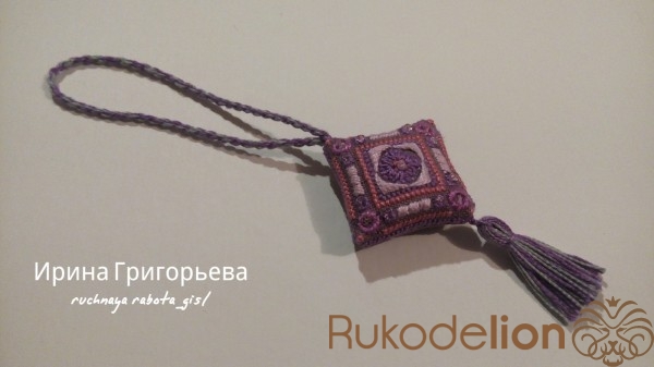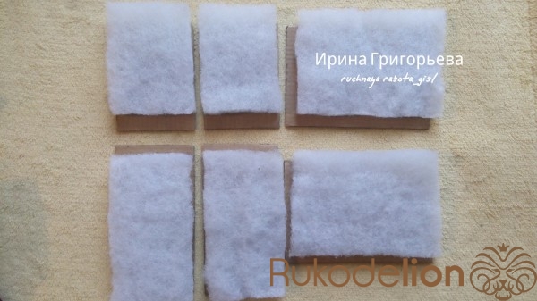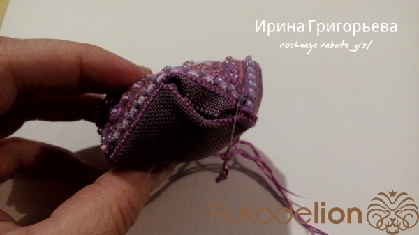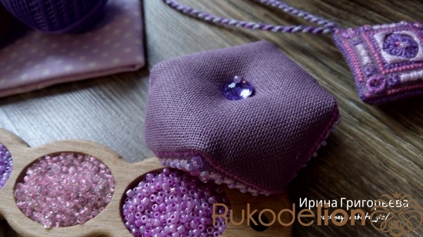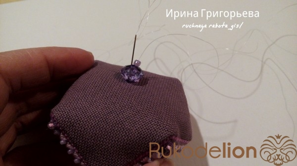 Для пошива маячка для ножниц нам понадобятся две детали с контурным швом "назад иголку". Для начала изготовим украшение для маячка - кисточку. Для этого возьмите кусочек картона, сверху положите нить (для закрепления кисти), намотайте на картон необходимое количество нитей ( я сделала около 10 оборотов). Разрежьте нити снизу. Отступив от верхнего края около сантиметра, перевяжите кисть нитью, заправьте концы нить в середину кисти. Обрежьте кончики кисти.