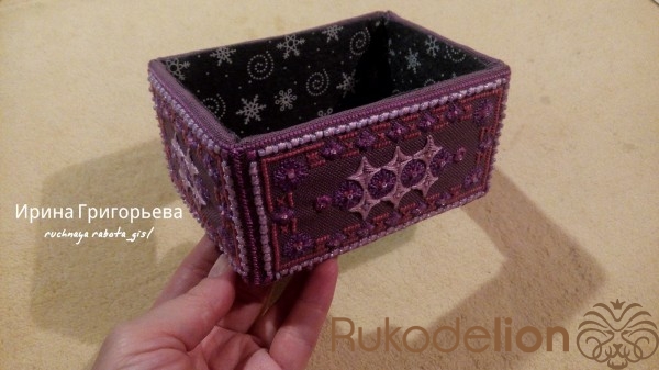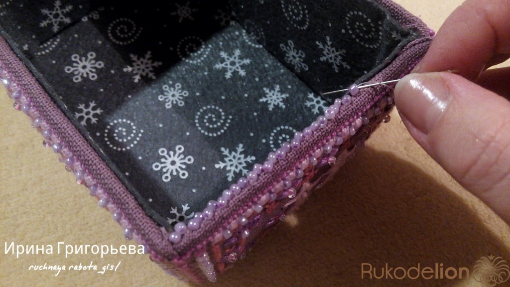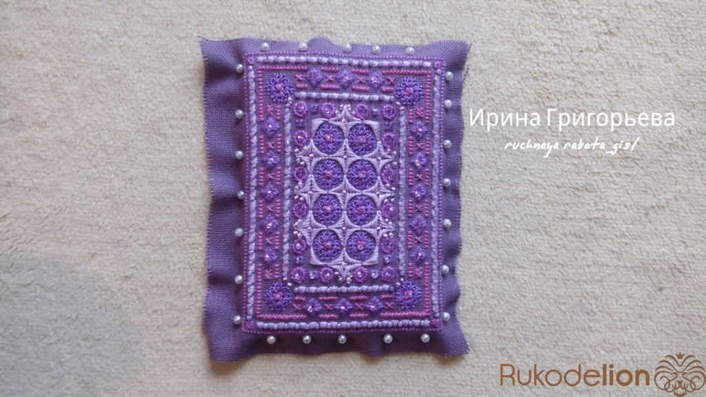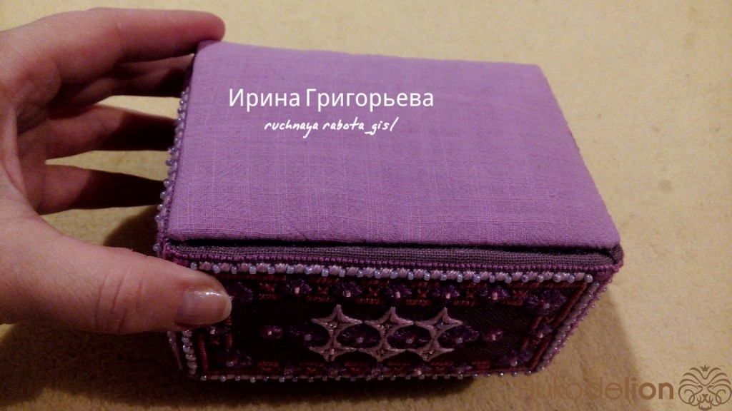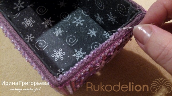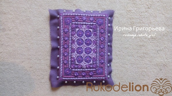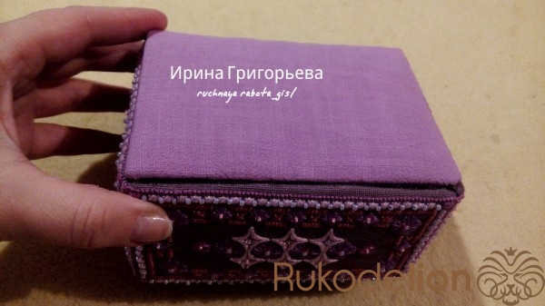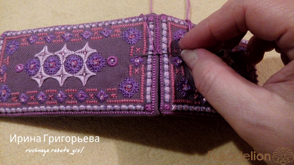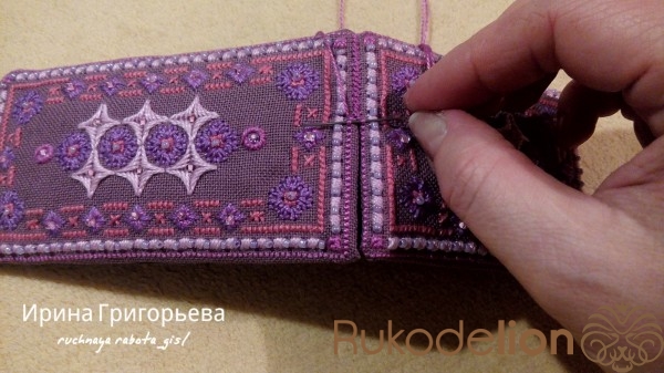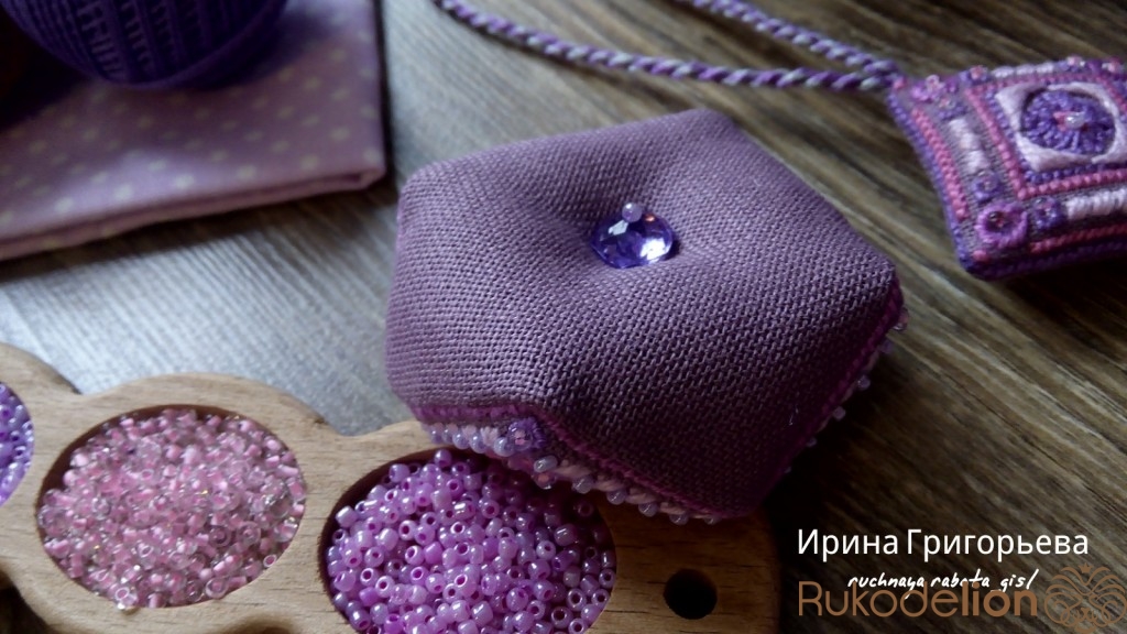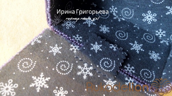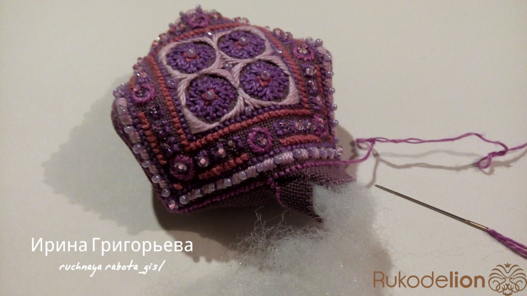 Для пошива маячка для ножниц нам понадобятся две детали с контурным швом "назад иголку". Для начала изготовим украшение для маячка - кисточку. Для этого возьмите кусочек картона, сверху положите нить (для закрепления кисти), намотайте на картон необходимое количество нитей ( я сделала около 10 оборотов). Разрежьте нити снизу. Отступив от верхнего края около сантиметра, перевяжите кисть нитью, заправьте концы нить в середину кисти. Обрежьте кончики кисти.