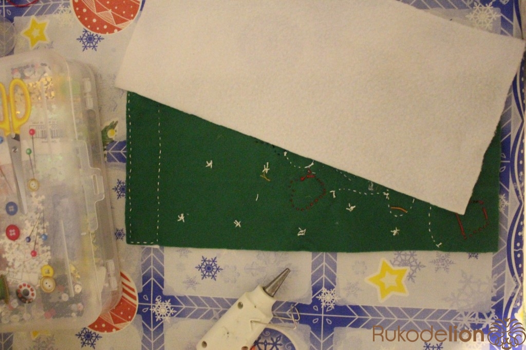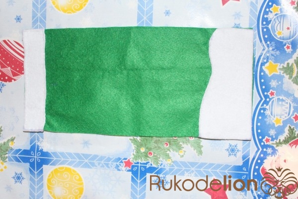 Берём вторую часть чехла, иголку и нитку под цвет зелёного фетра. И сшиваем обе части чехла петельным швом. Сшиваем по бокам