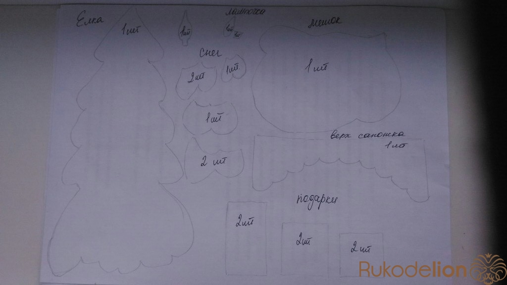 Вырезаем по  выкройке   подарки из желтого, розового ,зеленого и бордового фетра. Сшиваем части выкройки и набиваем, украшаем пайетками и бантиками.