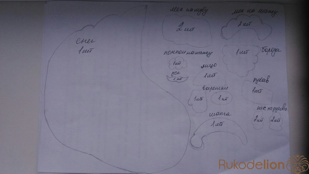 Сшиваем выкройки меха на шапку, шубу, рукава. Набиваем их синтепоном и пришиваем  к основе .