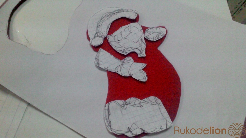 Вырезаем основу   Деда Мороза из красного фетра. Отдельно вырезаем детали: рукав и шапку из красного фетра . Из белого фетра вырезаем мех на шапку , шубу и рукава, а также усы и бороду. Из зеленого фетра - варежки.