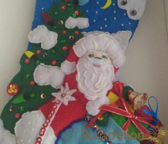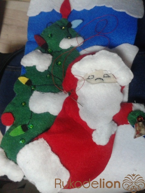 Пришиваем Деда Мороза на 2\3 части к сапожку заходя на елочку ,  набиваем наполнителем и пришиваем уже полностью.