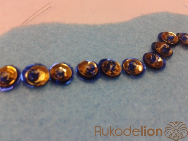 Пришиваем посох Деду Морозу и украшаем его бисером и пайетками.