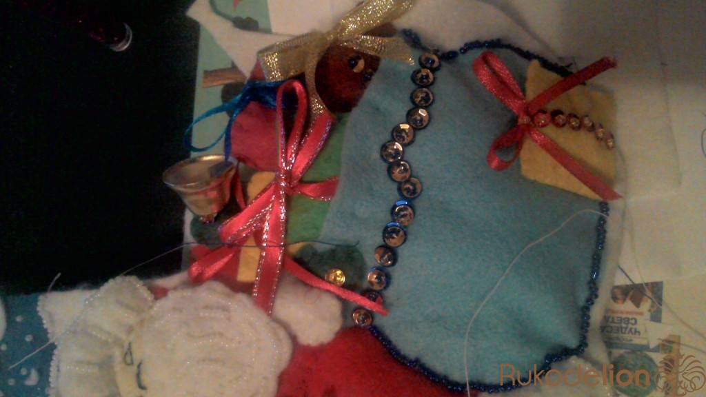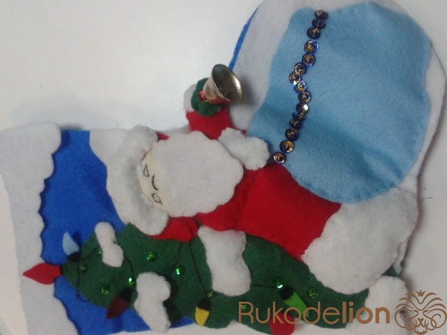 К поднятой руке пришиваем варежку и колокольчик, украшаем бисером и пайетками.