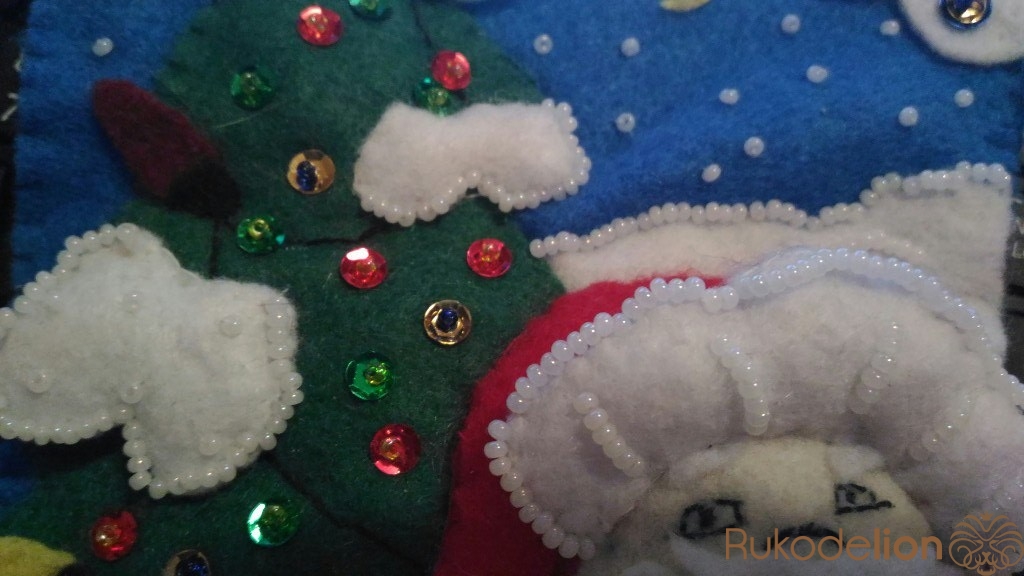 Пришиваем белый бисер по  контору и хаотично по центру к снежным веткам и к меху на шубе Деда Мороза. Мех на шапке украшаем белым бисером по контуру и вертикальными полосками. Бороду украшаем по контуру и по центру изогнутыми линиями.