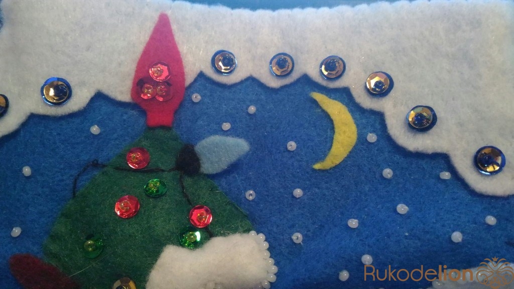 Пришиваем в разнобой на синем фоне белый бисер имитируя звезды.  На белом фоне волнистыми линиями имитируем сугробы. Пришиваем месяц  из желтого фетра.