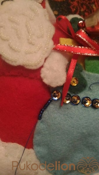 Займемся украшением работы: для этого пришиваем   бисер и пайетки  к  белому верху сапожка. К елочке пришиваем  разноцветный бисер и пайетки.