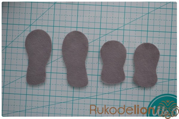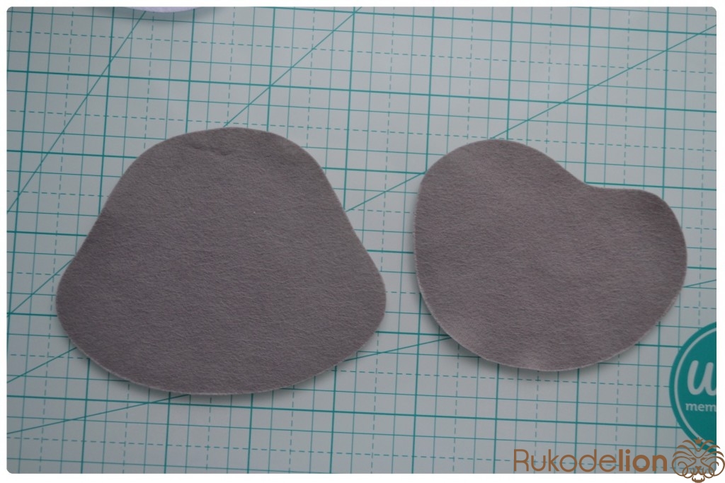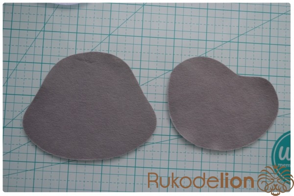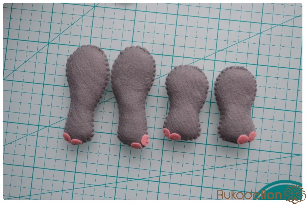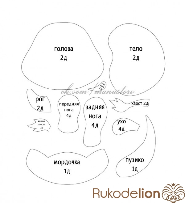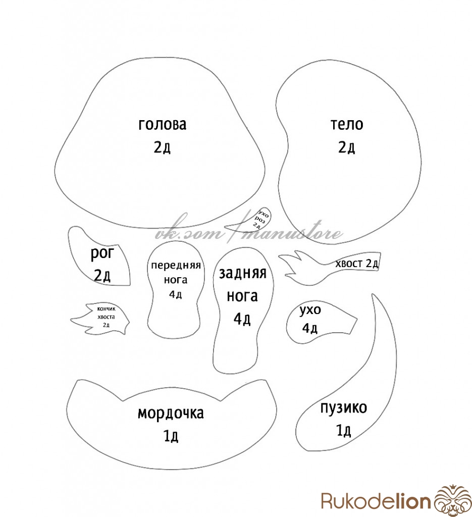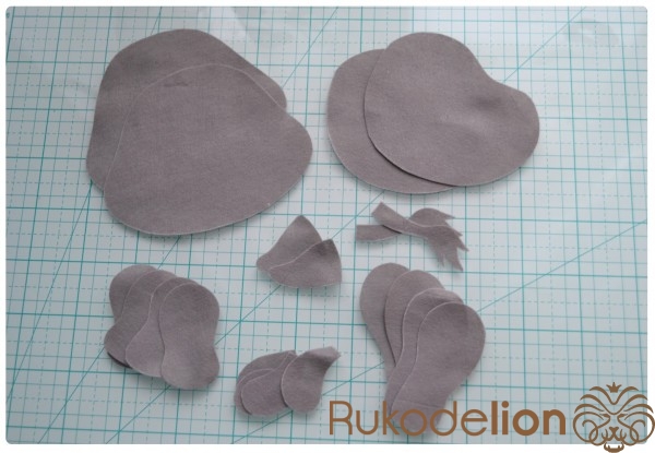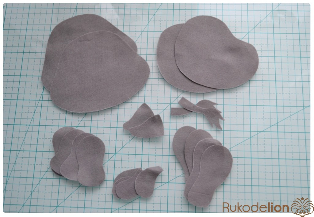 Так из серого фетра мы вырезаем 2 детали головы, 2 детали тела, 2 детали хвоста, 2 детали рога, 4 детали передней лапы, 4 детали задней лапы и 4 детали уха