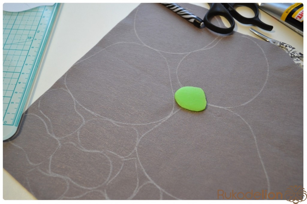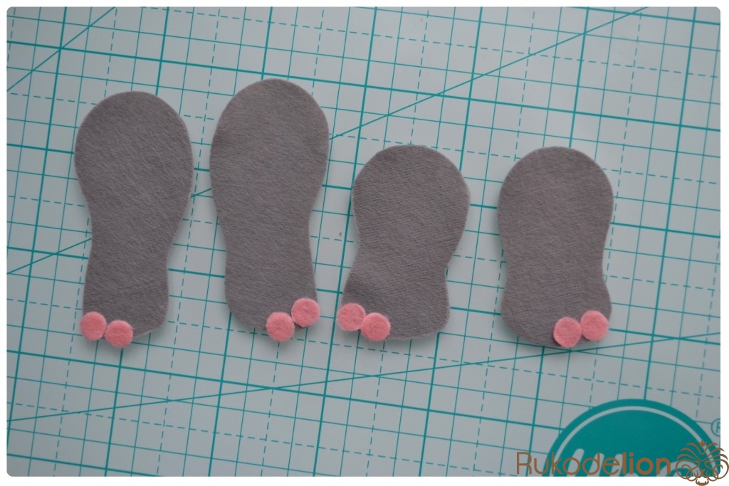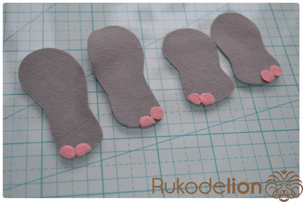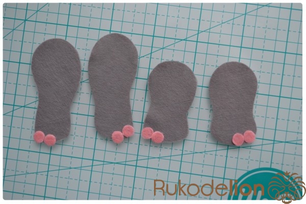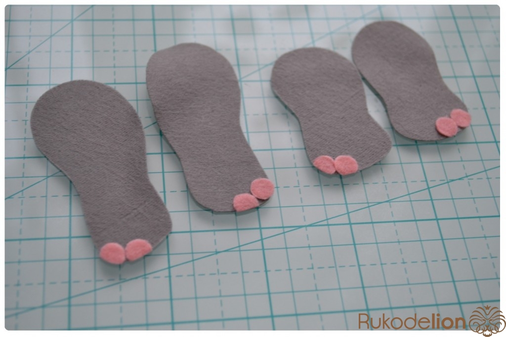 Клеем Момент Кристалл либо любым другим текстильным клеем приклеиваем розовые кружки по краям лапок, так чтобы кружочки немного выходили за края лапок