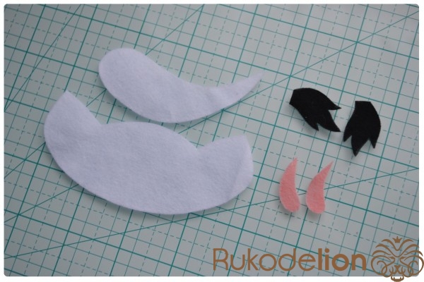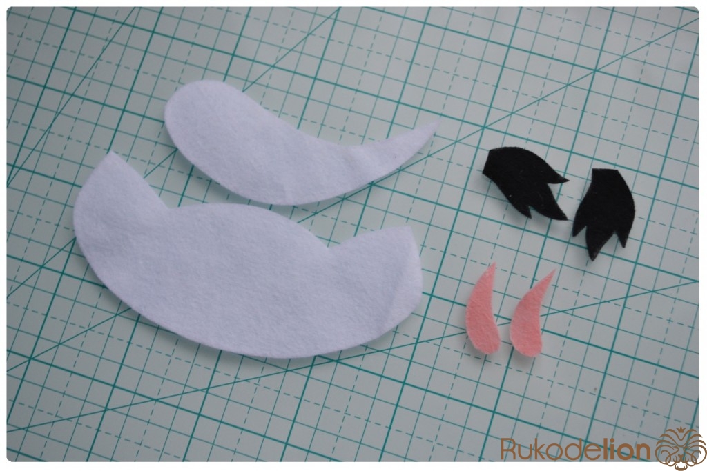 Из белого фетра мы вырезаем по одной детали мордочки и пуза. Из розового - две детали розовой части уха, а из черного - две детали кончика хвоста
