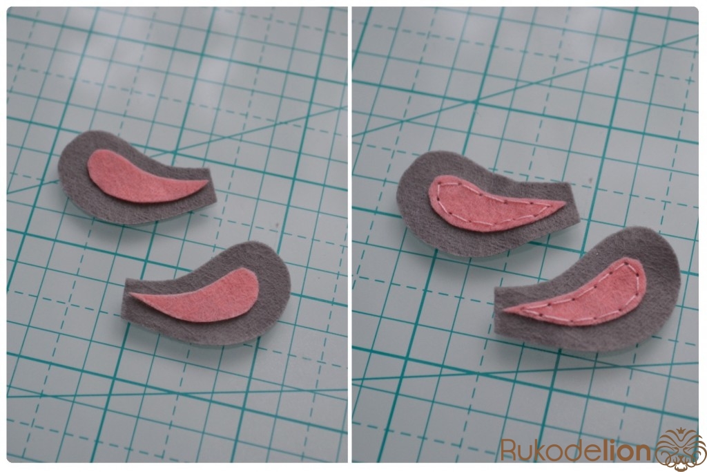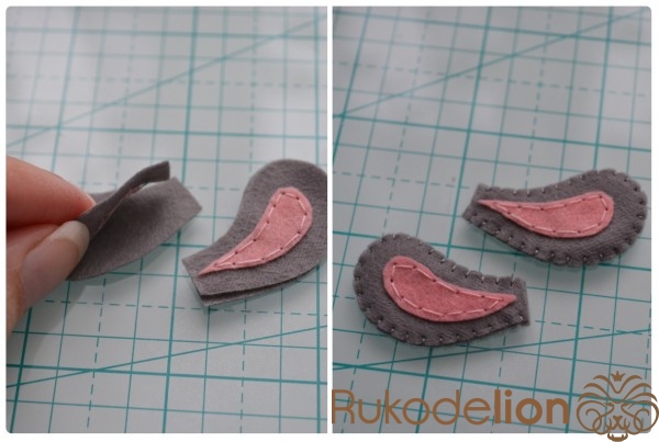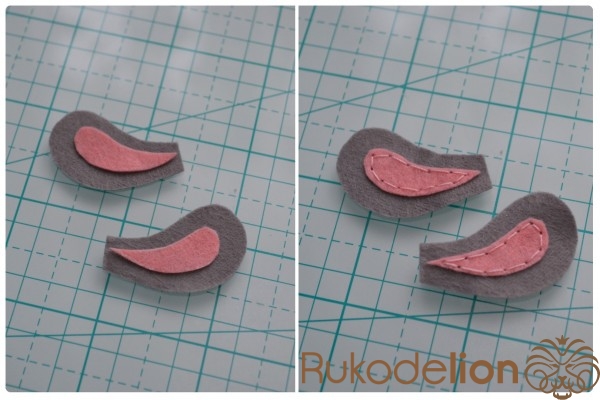 Берем две детали уха и прикладываем к ним розовые части ушек. Пришиваем розовые детальки розовыми нитками швом "назад иголка"
