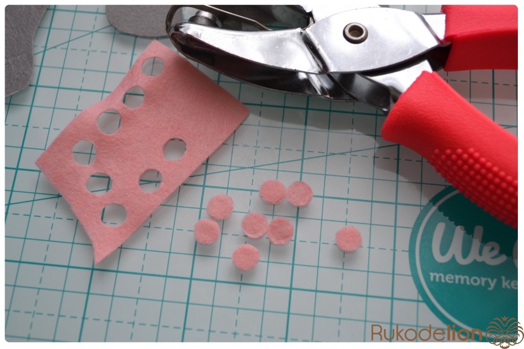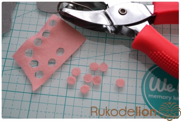 Дыроколом по фетру вырубаем из розового фетра 8 кружков. Если у вас нет такого дырокола, то эти детали можно вырезать мелкими ножницами. Диаметр таких кружком у меня примерно 5 мм