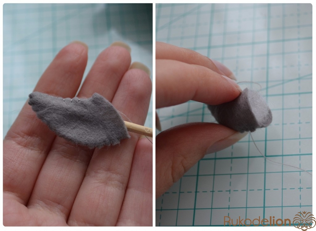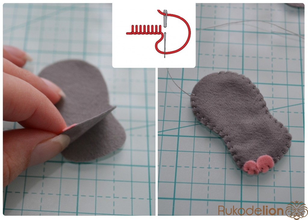Складываем по парам детали ушек. Сшиваем их обметочным швом серыми нитками. Синтепоном ушки мы НЕ набиваем