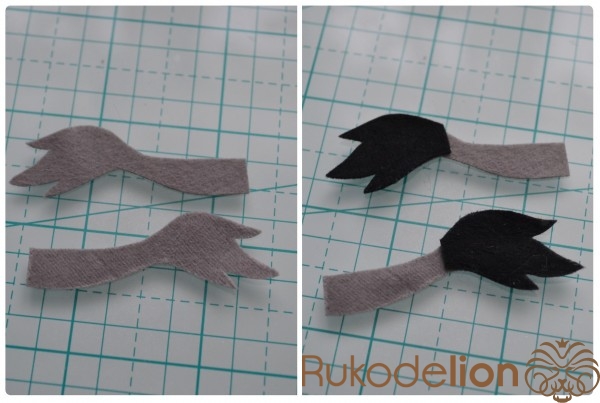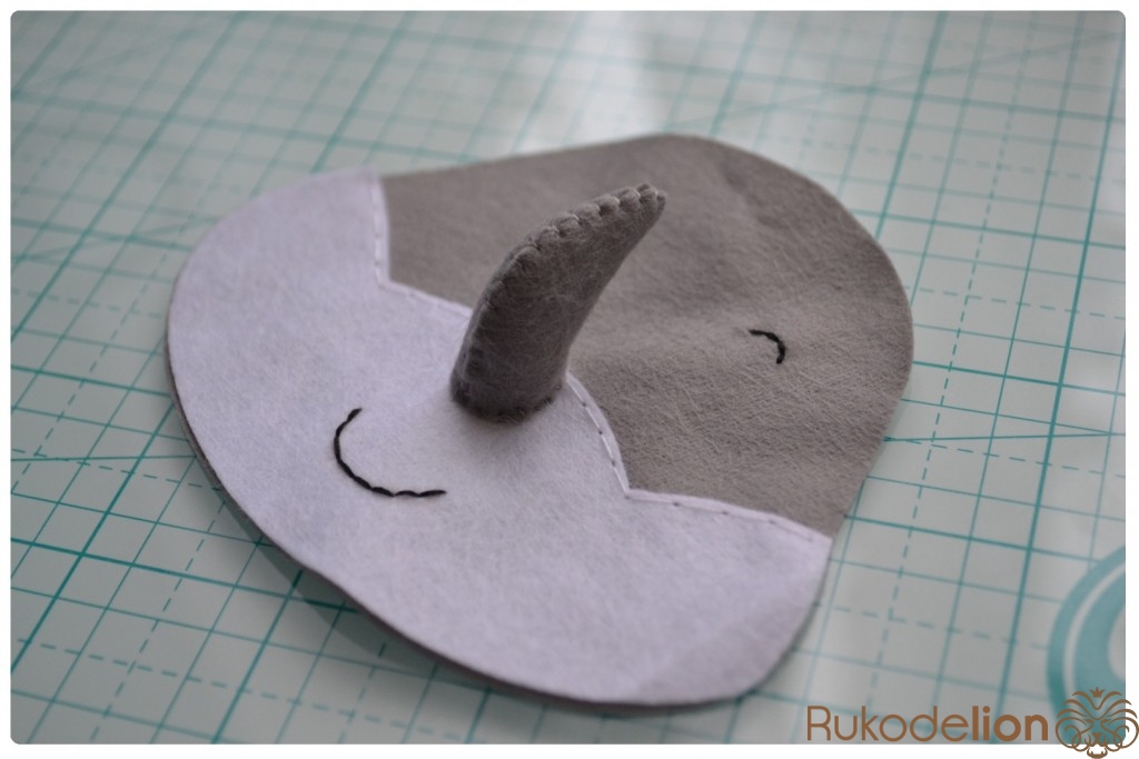 Также из черного фетра мы вырезаем две каплевидные детали - ноздри. Приклеиваем их под рогом