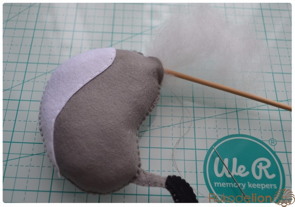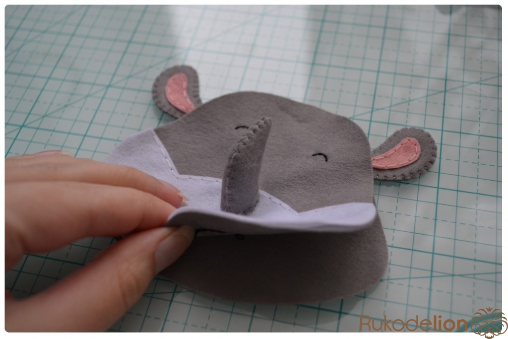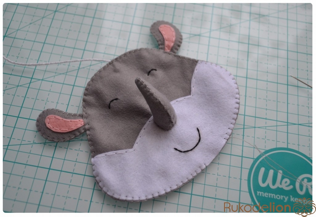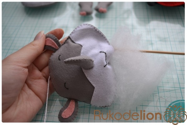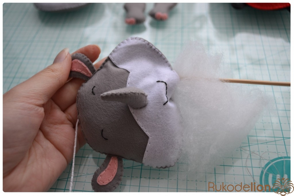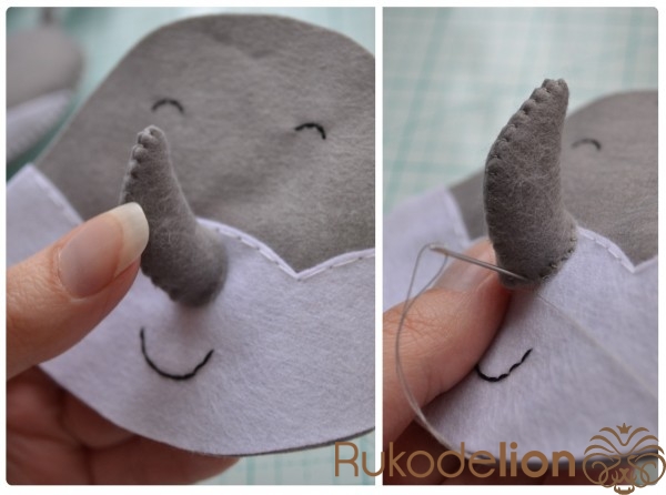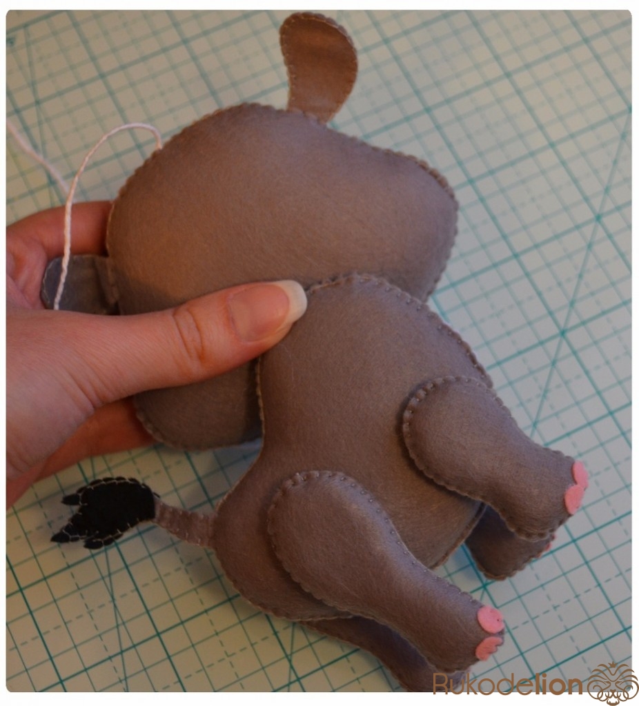 p.s. Так как мой носорожек будет украшать мобиль, при сшивании  в область макушки я вкладываю еще нить ириса