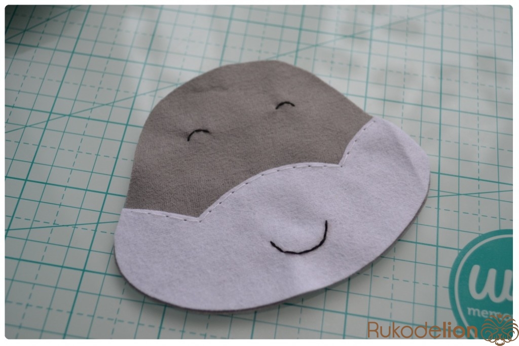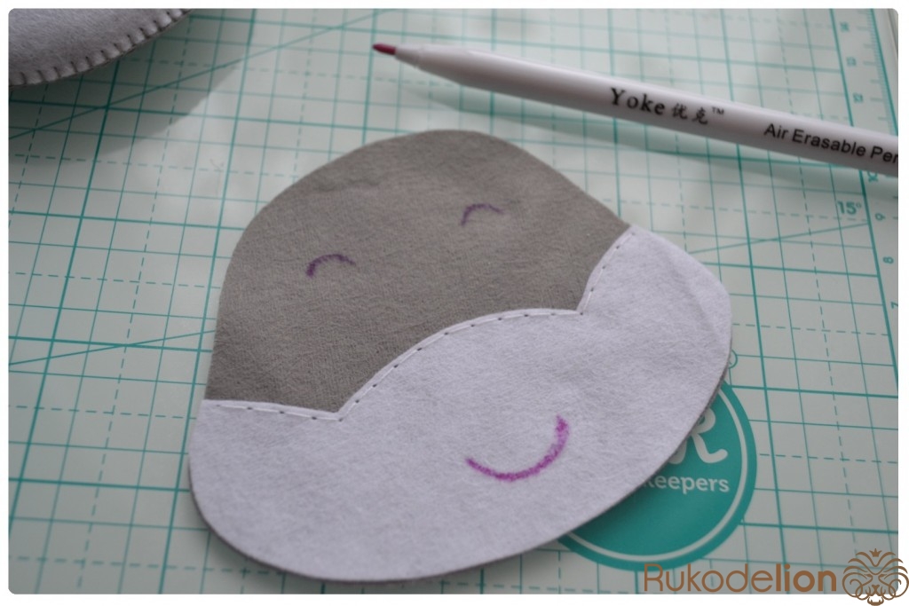 Самоисчезающим маркером нарисуем бровки и ротик на детали головы, где у нас уже пришита мордочка
