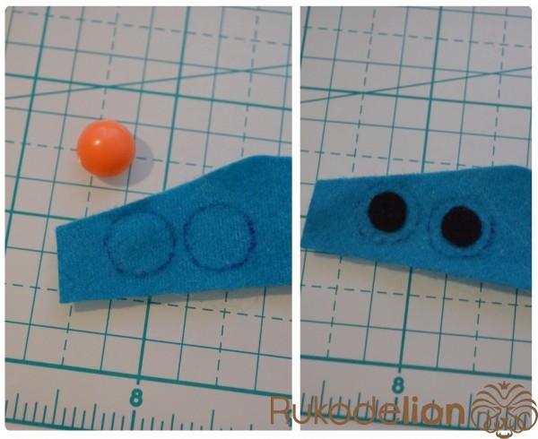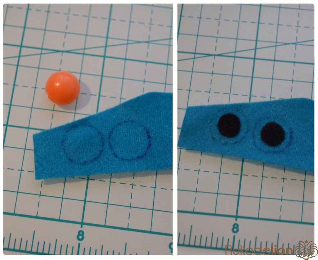 На синем фетре рисуем два круга диаметром примерно 1 см. Обычно для этого я обвожу какую-нибудь полубусину. Из черного фетра дыроколом вырубаем два круга и приклеиваем их по центру каждого синего круга