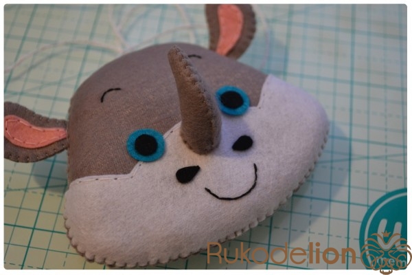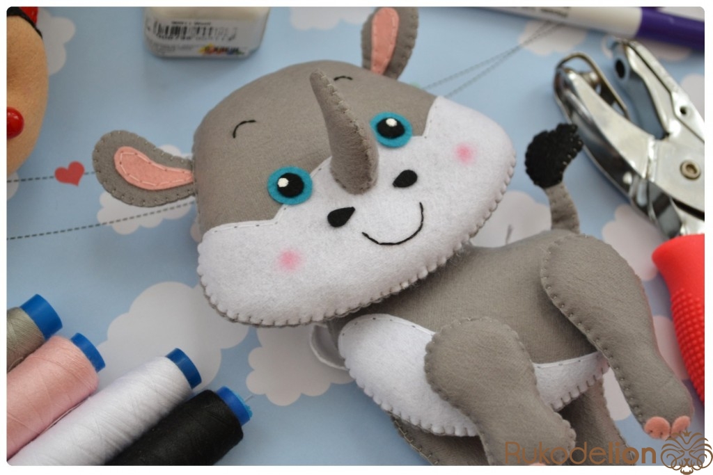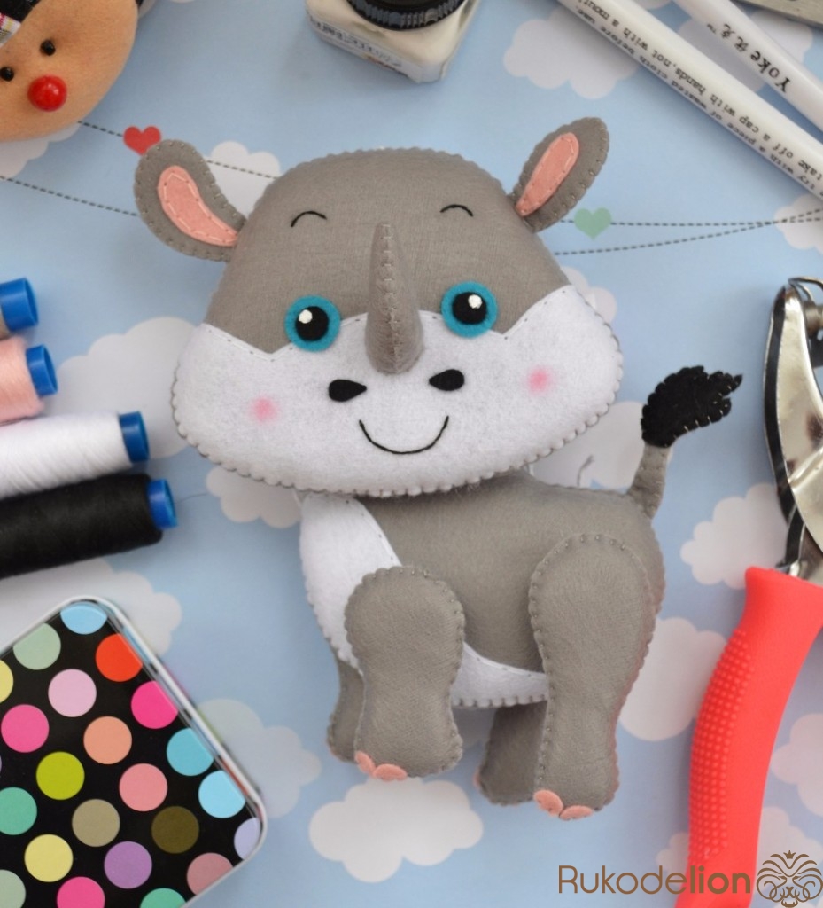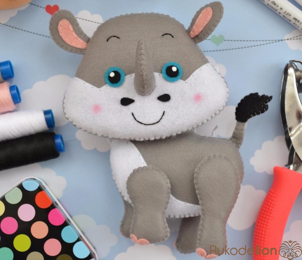 Вместе с вами мы продолжаем шить фетровых зверюшек, и сегодня мы сошьем вот такого фетрового носорожку с объемным рогом!