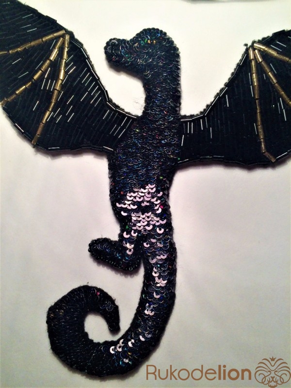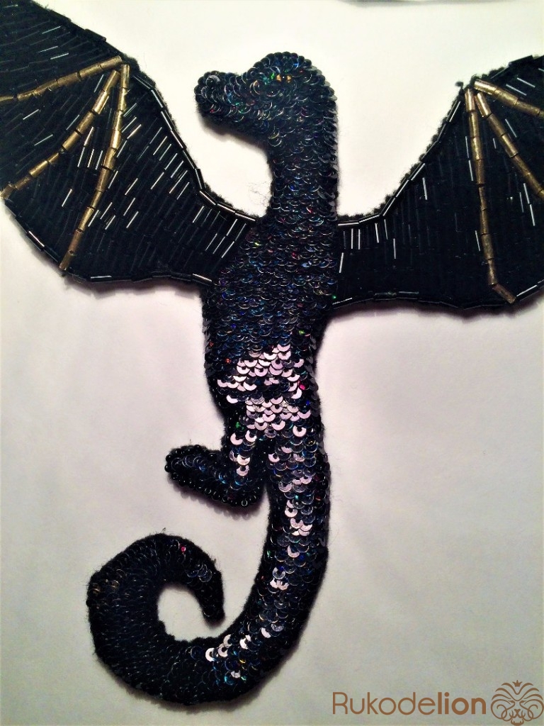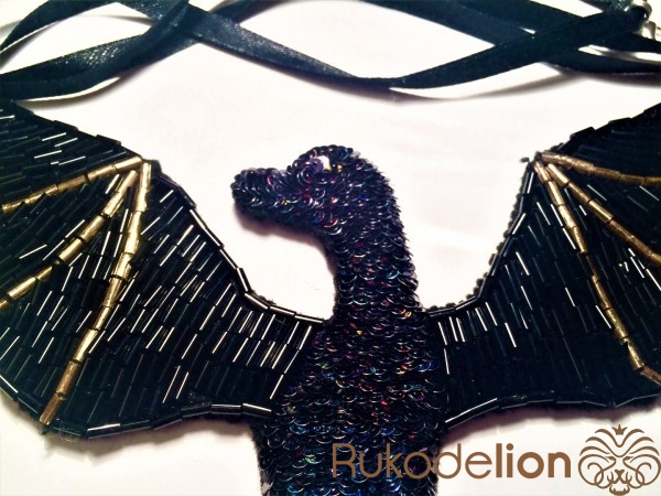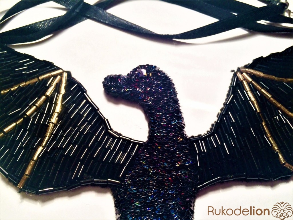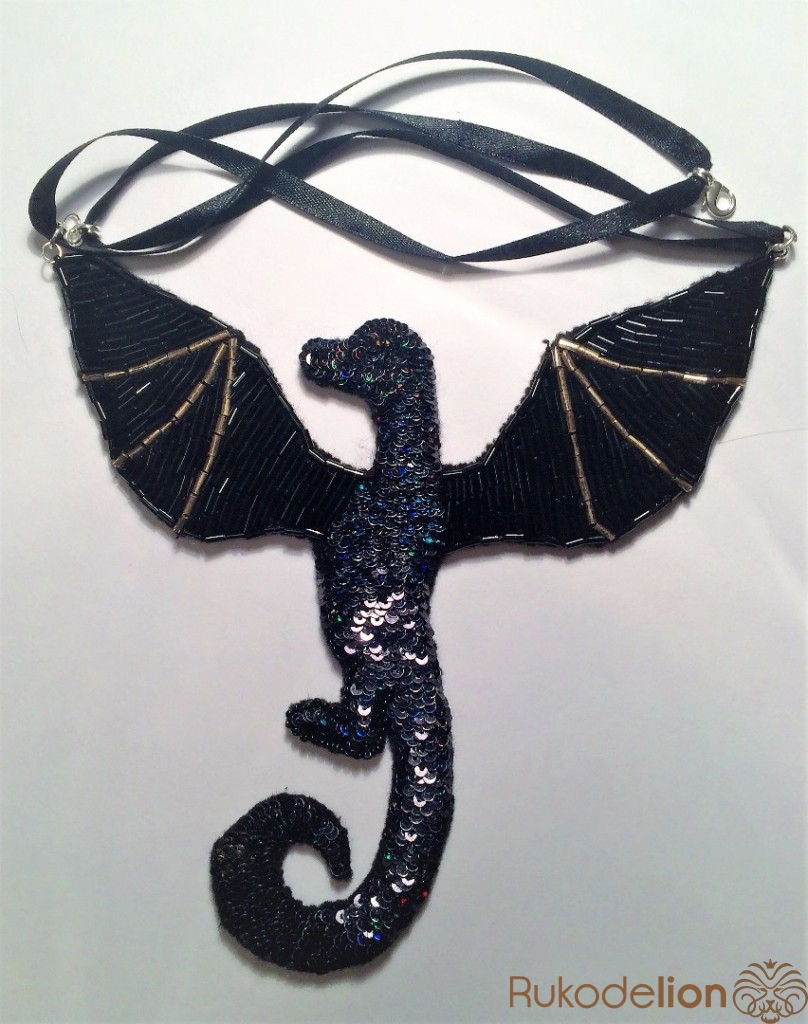 Ожерелье, выполненное в виде черного дракона с переливающейся чешуей из пайеток и блестящими черно-золотыми крыльями.